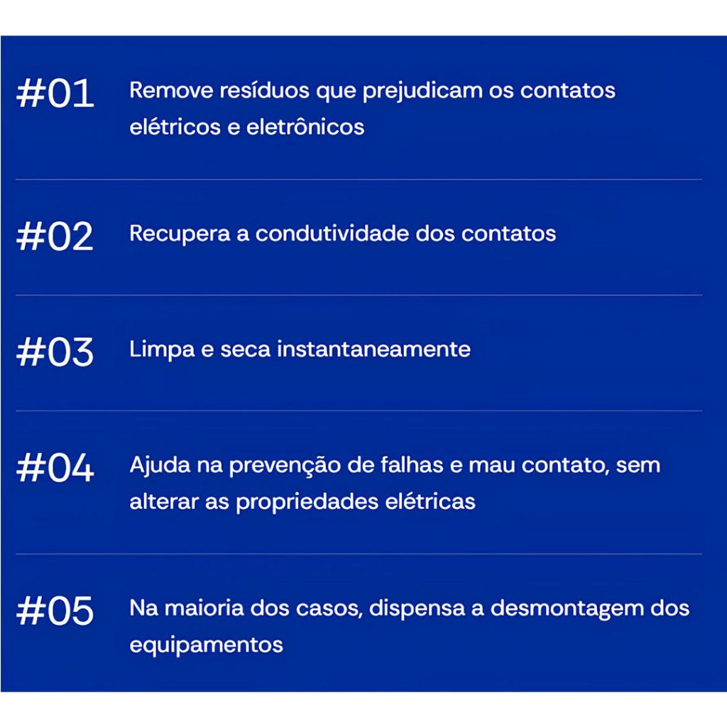 Car Contato Limpa Contato Elétricos Características: É um limpa contato de elétricos e eletrônicos especialmente desenvolvido para remover graxas, sujeiras, resíduos de umidade que causam oxidação e isolamento dos contatos, óleos e outros contaminantes das superfícies dos contatos elétricos e eletrônicos. Dúvidas frequentes: O Produto é novo? Sim. Nós trabalhamos apenas com produtos novos e com garantia. O Produto é original? O produto é 100% Novo e Original com Nota Fiscal! Em quanto tempo recebo minha compra? Seus produtos serão enviados no mesmo dia após a confirmação do pagamento. (Exceto sábado, domingo e feriados) Possuem loja física? Nós somos a Pinho Diesel e Ferramentas, localizada no CADEG no Rio de Janeiro. Nos acompanhe nas redes sociais ou entre em contato com um de nossos vendedores. Tem alguma dúvida sobre o produto ou sobre a compra? Deixe sua pergunta abaixo, que responderemos prontamente.