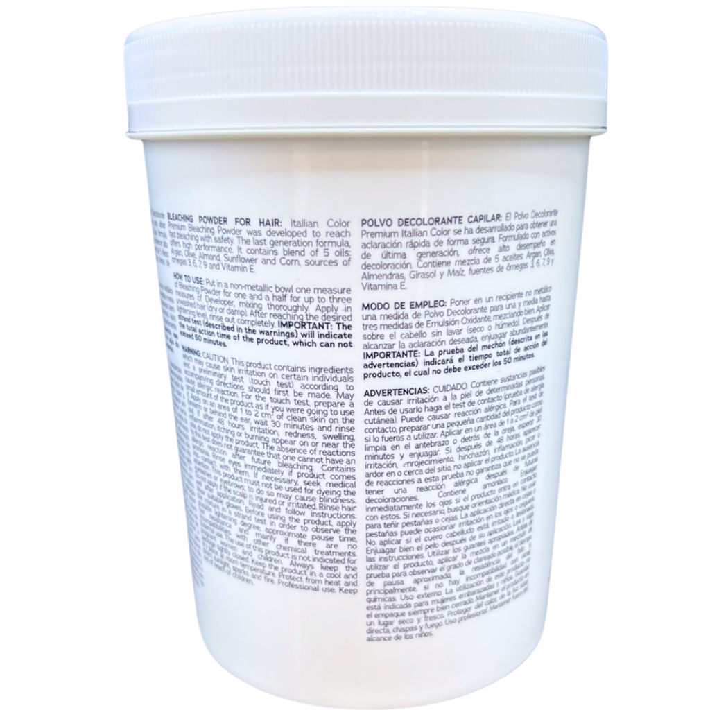 3 X DESCOLORANTE PREMIUM POWDER ITALLIAN COLOR DESCRIÇÃO: O Pó Descolorante Premium Itallian Color foi desenvolvido para obter clareamento rápido de maneira segura. Sua fórmula possui ativos de última geração capazes de oferecer alta performance em altos níveis de exigência. Clareamento rápido e seguro, com abertura de até 9 tons. Pó fino, que incorpora-se facilmente à Emulsão Oxidante, formando uma mescla homogênea e consistente. A combinação Pó Descolorante Premium Itallian Color + Emulsão Oxidante Itallian Oxi não escorre no decorrer do processo, o que facilita o trabalho do profissional. Possui Blend de 5 óleos: Argan, Oliva, Amêndoas, Girassol e Milho, fontes de ômegas 3, 6, 7, 9 e Vitamina E. ATIVOS: Blend de 5 Óleos: Concentrado 100% vegetal composto por Argan, Oliva, Amêndoas, Girassol e Milho, rico em ômegas 3, 6, 7, 9 e Vitamina E. Proporciona reposição lipídica, o que contribui para um efeito reparador dos cabelos Sela as cutículas, fornecendo brilho intenso Confere emoliência, suavidade e maciez aos fios. Outras Características do Produto Clareamento rápido e seguro, com abertura de até 9 tons A proporção da mistura pode variar de 1:1,5 a 1:3, de acordo com a técnica a ser realizada Pó fino, que incorpora-se facilmente à Emulsão Oxidante, formando uma mescla homogênea e consistente A combinação Pó Descolorante Premium Itallian Color + Emulsão Oxidante Itallian Oxi não escorre no decorrer do processo, o que facilita o trabalho do profissional. MODO DE USO: Coloque uma medida de Pó Descolorante Premium Itallian Color para uma medida e meia de ltallian Oxi em um recipiente não metálico. Adicione o oxidante aos poucos, misturando bem. A proporção da mistura pode variar de 1:1,5 até 1:3, de acordo com a técnica a ser realizada. A aplicação deve ser feita em cabelos não lavados, porém, podem estar úmidos dependendo da técnica utilizada. Para realização de mechas ou reflexos: Aplique mecha por mecha com um pincel, com o pente ou utilizando os dedos com uso de luvas ou dedeiras. Assim que atingir o clareamento desejado*, enxágue. Para processos de limpeza de cor: Aplique a mistura a uma distância de mais ou menos 1cm da raiz massageando as mechas. Quando estiver para alcançar o tom desejado*, leve a mistura à raiz sem encostar no couro cabeludo para uniformizar a cor. Enxágue. *Tempo de pausa: aproximadamente 60 minutos. Especificações Organolépticas Aspecto: Pó Cor Azul PRECAUÇÕES: CUIDADO. Contém substâncias passíveis de causar irritação na pele de determinadas pessoas. Antes de usar, faça a prova de toque. Pode causar reação alérgica. Para a prova de toque, preparar uma pequena quantidade do produto aplicando no antebraço ou atrás da orelha, deixar uma pausa de 20 minutos e lavar a área em seguida. Se após 24 horas surgir irritação na pele, coceira ou ardência no local ou na proximidade, fica provada a hipersensibilidade da pessoa ao produto e, portanto, o mesmo não deve ser usado. Contém Amônia. Evitar contato com os olhos. Em caso de contato com os olhos, lavar com água em abundância e, se necessário, procurar um médico. Não usar nos cílios e sobrancelhas, pois poderá causar irritação e cegueira. Em caso de irritação, suspender o uso e procurar orientação médica. Não aplicar se o couro cabeludo estiver irritado ou lesionado. Usar luvas adequadas. Antes de utilizar o produto, aplicar a mistura em uma mecha teste para observar o grau de clareamento possível, o tempo de pausa aproximado, a resistência do fio e principalmente se não há incompatibilidade com outras químicas. Uso externo. A utilização deste produto não é indicada para gestantes e crianças. Guardar a embalagem sempre bem fechada, em local seco e fresco. Uso profissional. Manter fora do alcance de crianças.