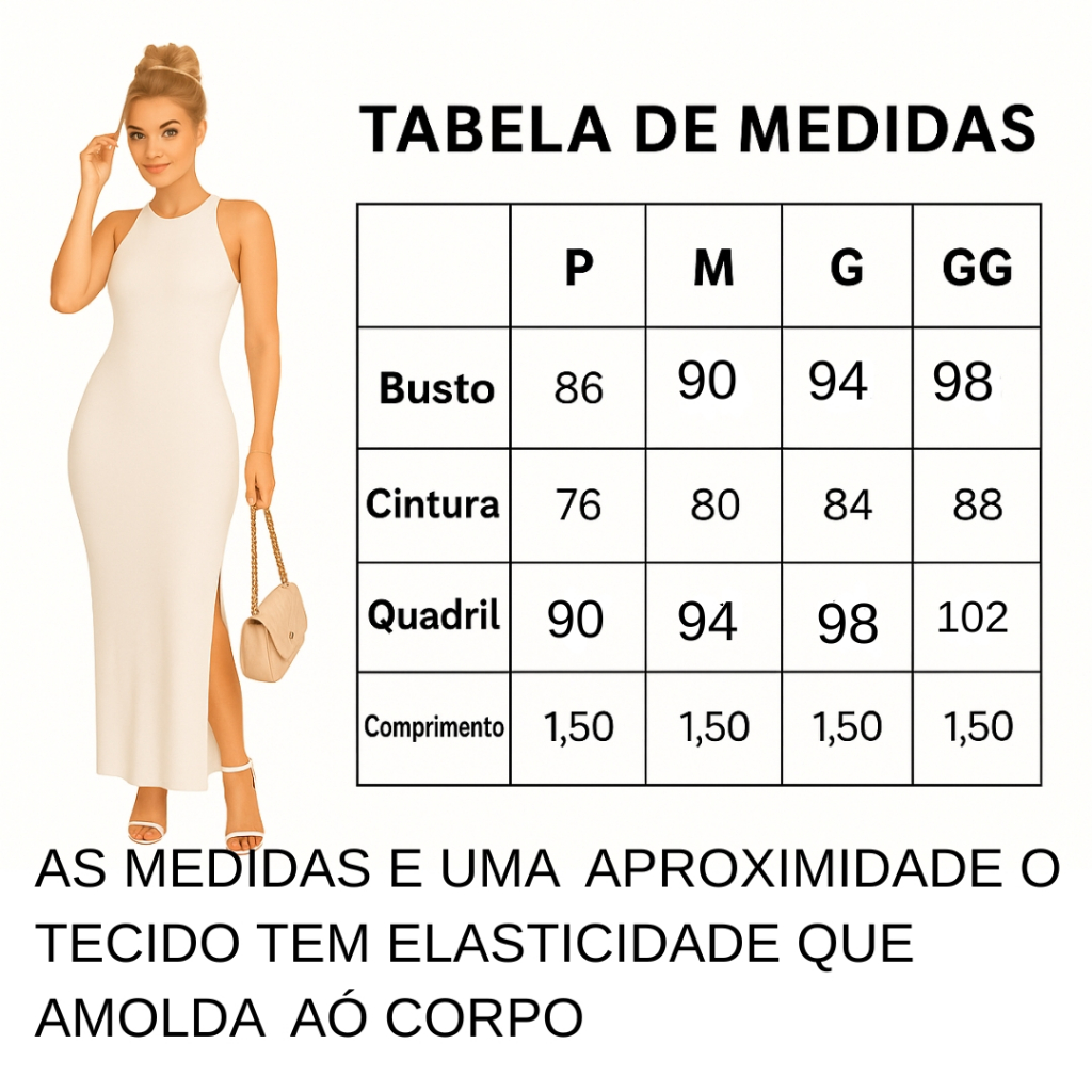 ✨ Descrição do Produto – Vestido Longo Suplex Elegante com Fenda Sinta-se poderosa, elegante e confortável em qualquer ocasião com este vestido longo em tecido suplex premium. Desenvolvido para valorizar suas curvas com classe, ele combina modelagem impecável, caimento perfeito e um toque moderno que transforma qualquer look em um visual de destaque. O tecido suplex oferece elasticidade na medida certa, garantindo liberdade de movimentos sem perder a estrutura. A fenda lateral alonga a silhueta e traz aquela sensualidade discreta que nunca sai de moda. Já o recorte sofisticado no busto e nas costas cria um efeito elegante e marcante — perfeito para eventos, jantares, festas, passeios e composições casuais de alto nível. 💎 Benefícios do Vestido ✔ Tecido Suplex Premium: macio, encorpado, confortável e com ótima elasticidade. ✔ Modelagem que valoriza: afina a cintura e desenha o corpo sem marcar. ✔ Fenda lateral elegante: alonga visualmente e dá mais leveza ao caminhar. ✔ Ideal para qualquer ocasião: combina com salto, sandálias, acessórios finos ou casuais. ✔ Não amassa facilmente: perfeito para quem gosta de praticidade. ✔ Toque suave na pele: zero desconforto, mesmo para usar o dia inteiro. ✔ Cai bem em todos os corpos: tamanhos P, M, G e GG disponíveis. 📏 Informações do Produto NÃO TEM BOJO Tecido: Suplex Premium Modelo: Vestido longo elegante com fenda Caimento: Justo com elasticidade Tamanhos: P, M, G, GG Comprimento: 1,50 cm (todos os tamanhos Indicado para: festas, eventos, jantares, baladas, casual chic, almoço, fotos e conteúdo digita ❤️ Por que você vai amar esse vestido? Porque ele entrega elegância, conforto, versatilidade e presença — tudo em uma única peça. É aquele vestido que veste bem, destaca sua beleza natural e faz você se sentir confiante em qualquer ambiente.