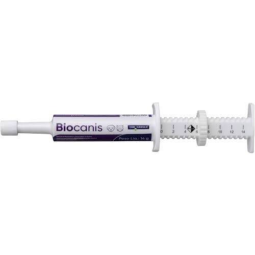 3 Unidades - Biocanis Gel Oral 14g Probiótico Para Cães E Gatos 3 Seringas de 14g. Biorregulador do trato intestinal dos animais. Biocanis é um gel probiótico à base de bactérias probióticas. Indicações: Qualquer situação de alteração de rotina dos animais como: desmame, mudança de alimentação, viagens, adestramento, acasalamento e alterações de ambientes. Ingredientes: Aluminosilicato, óleo vegetal, amido de milho, etoxiquin, polisorbato, sacarose, dióxido de silício, Bifidobacterium animalis, Enterococcus faecium, Lactobacillus acidophilus. Modo de uso e dosagens para cães e gatos: Recém-nascidos - 2 g Adultos - 4 g Parto - 4 g Obs.: se necessário, repetir com intervalos de 6-12 horas ou a critério do médico-veterinário.