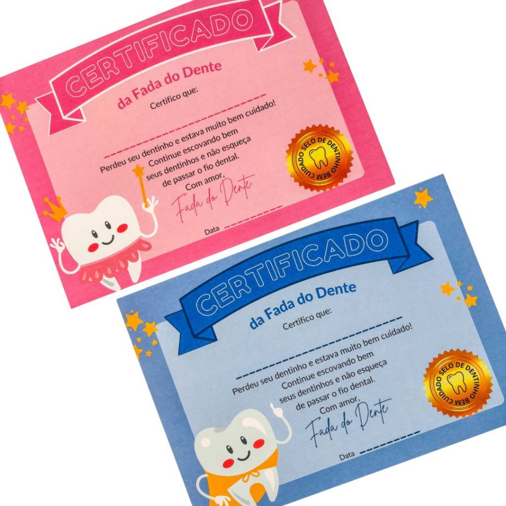 🧚♀ Kit Certificado Fada do Dente – Rosa e Azul 🦷✨ Disponível nas quantiadades: 📄 30 unidades | 📄 60 unidades | 📄 90 unidades Perfeito para presentear pequenos pacientes após a queda do dentinho! Um mimo cheio de magia e carinho 💖💙 🎨 O que vem no kit? Metade dos certificados no modelo rosa e a outra metade no modelo azul. 📐 Especificações: • Tamanho: 21x15 cm (meia folha A4) • Papel de alta gramatura: 240g • Impressão profissional com cores vibrantes • Papel firme e resistente, com acabamento impecável 📌 Ideal para consultórios odontopediátricos que valorizam o encantamento e reforço positivo!