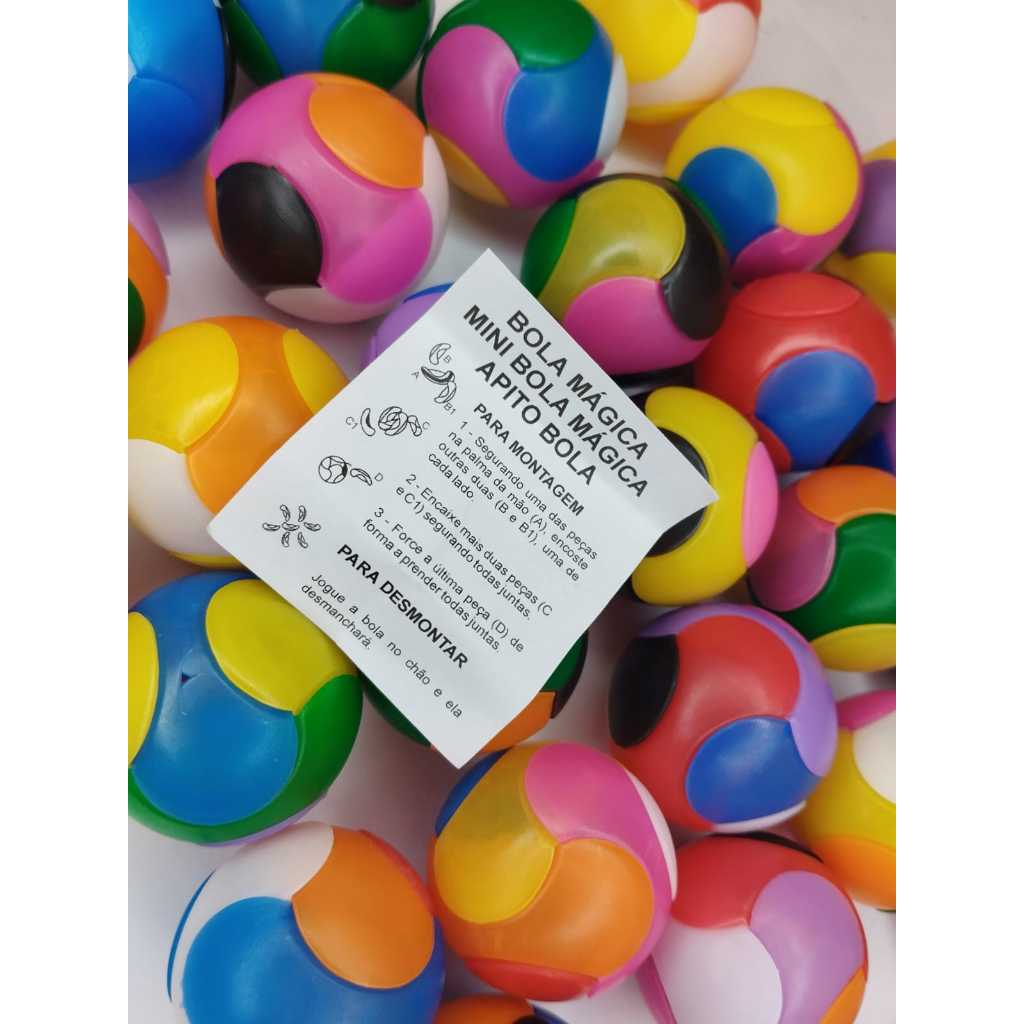 ITEM ANUNCIADO: - 30 BOLINHA MÁGICA DE MONTAR (APROXIMADAMENTE 4 CM) COMO USAR: 1- Segurando uma das peças na palma da mão, encoste outras duas nas laterais da primeira peça. 2- Encaixe mais duas peças segurando todas juntas. 3- Force a última peça de forma a prender todas juntas. QUALQUER DÚVIDA ESTAMOS A DISPOSIÇÃO BOLINHA MÁGICA.