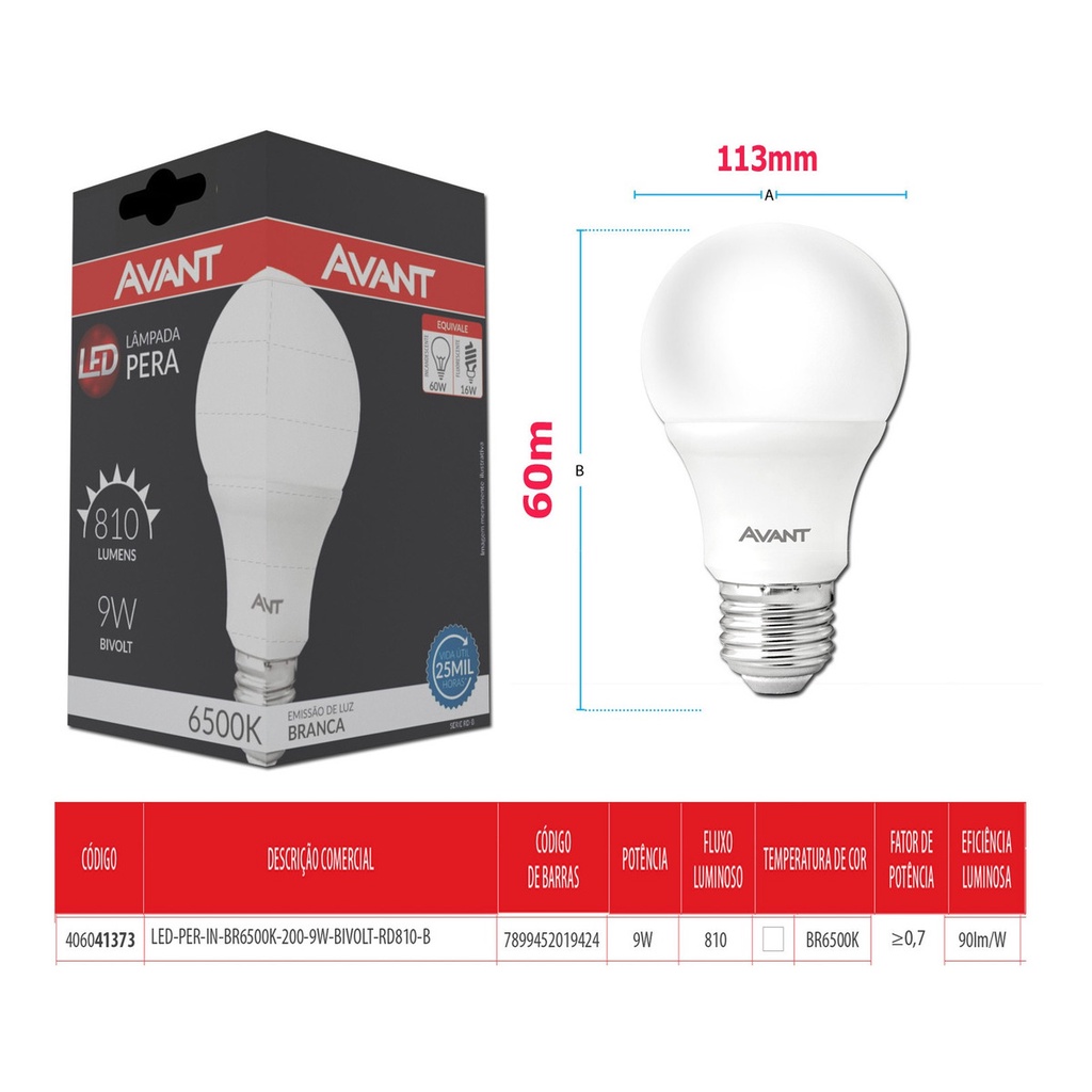 Lâmpada Led 9w Bulbo Soquete E27 Bivolt Casa Comércio A linha de lâmpadas Pera LED Avant é indicada para ambientes internos e por ser mais econômica e eficiente é a solução ideal para substituir as lâmpadas incandescentes ou fluorescentes. Ilumine seu ambiente residencial, comercial ou corporativo com as lâmpadas Pera LED Avant. - Corpo em policarbonato branco e difusor em policarbonato leitoso - Vida Útil 25 mil horas. - Indicado para uso Interno - Formato similar às lâmpadas incandescentes tradicionais. Referencia: 3669 - Código: 406041373 - Modelo: LED-PER-IN-BR6500K-200-9W ( PERA LED (A60) SÉRIE RD-B). - Marca: Avant - Potência: 9w - Tensão: Bivolt Automático. - Tensão de entrada: 100V a 240V. - Fluxo Luminoso: 810 Lumens - Emissão de Luz: Branca - Temperatura da Cor: 6500K - Fator de Potência: >0,7 - Eficiência Luminosa: 90lm/W - Temperatura ambiente: -5C a 40C. - Base: E27 - Ângulo de Abertura: 200 graus - IRC: >80 - Índice de Proteção: IP20 - Equivalência : Incandescente 60w / Fluorescente 16W Dimensões Aproximadas: - Altura: 113mm - Largura: 60mm - Comprimento: 60mm - Peso: 035 gramas *** GARANTIA DE 1 ANO CONCEDIDO PELO FABRICANTE ***
