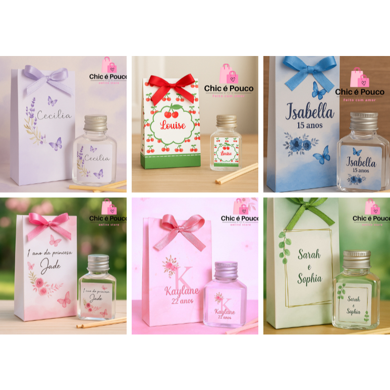 - 30 frascos pet com aromatizador 35 ml - 30 caixinhas personalizada feito em papel offset 180 gr fosco - 30 fitas de cetim para fazer o laço - 60 palitos fragrância temos: - Mamãe bebê - Lavanda - Cereja com avelã ✨ Encante seus convidados com charme e sofisticação! ✨ Nosso mini aromatizador personalizado é a lembrancinha perfeita para seu evento especial, seja chá de bebê, chá de fraldas, batizado, aniversários infantis ou festas de 15 anos. Produzidos artesanalmente com essências de qualidade, eles oferecem uma experiência única e inesquecível. Por que escolher nossos aromatizadores? Frascos personalizados com nome Essências suaves Embalagens delicadas e elegante 👉 Como personalizar? após a compra "Clique em "CHAT", e envie as informações: frase e o nome para personalização. ❤️ Aproveite e transforme seu evento em algo memorável! ❤️"