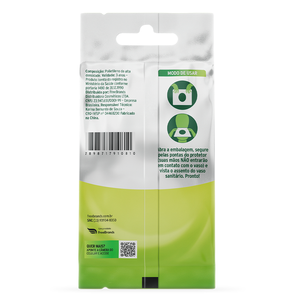 KIT COM 10 EMBALAGENS DE FREECÔ ASSENTINHO - 3 UNIDADES POR EMBALAGEM - 3x10 = 30 ASSENTINHOS Higiene, Praticidade e Segurança ao Usar o Vaso Sanitário! O FreeCô Protetor Descartável de Assento Sanitário é a solução perfeita para garantir sua proteção em banheiros públicos ou coletivos, como os de rodoviárias, aeroportos, escolas, academias, universidades, postos de gasolina, restaurantes, entre outros. Benefícios: - Proteção Total: Evita o contato da sua pele com a superfície do assento, reduzindo o risco de contrair doenças como micose, escabiose (sarna), candidíase, tricomoníase, piodermite, entre outras. - Portátil e Prático: Cada embalagem é compacta e fácil de transportar em bolsas, necessaires e mochilas. - Fácil de Usar: Abra a embalagem, retire um protetor e posicione sobre o assento sanitário sem que suas mãos toquem o vaso. Modo de Uso: Abra a embalagem e retire uma unidade do FreeCô Protetor de Assento. Segure pelas extremidades e cubra o assento do vaso sanitário. Pronto! Use o vaso sanitário com tranquilidade e segurança.
