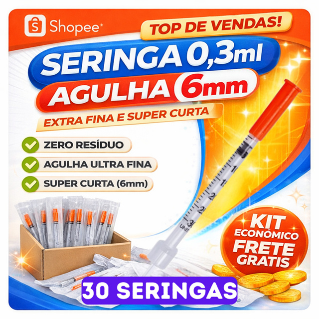 Catalogado na subcategoria Suprimentos Médicos (de Saúde), 30 Seringas insulina 0,3ml (30UI) c/ Agulha Fixa 6X0,25 CURTA, EXTRA FINA - Botox, Homônios etc - VP está à venda na Shopee Brasil por R$ 79,91 (27% de desconto sobre o preço original de R$ 109,47). Nota 4.9 de 5 na Shopee e 65 unidades vendidas, este produto se destaca pelo excelente custo-benefício.