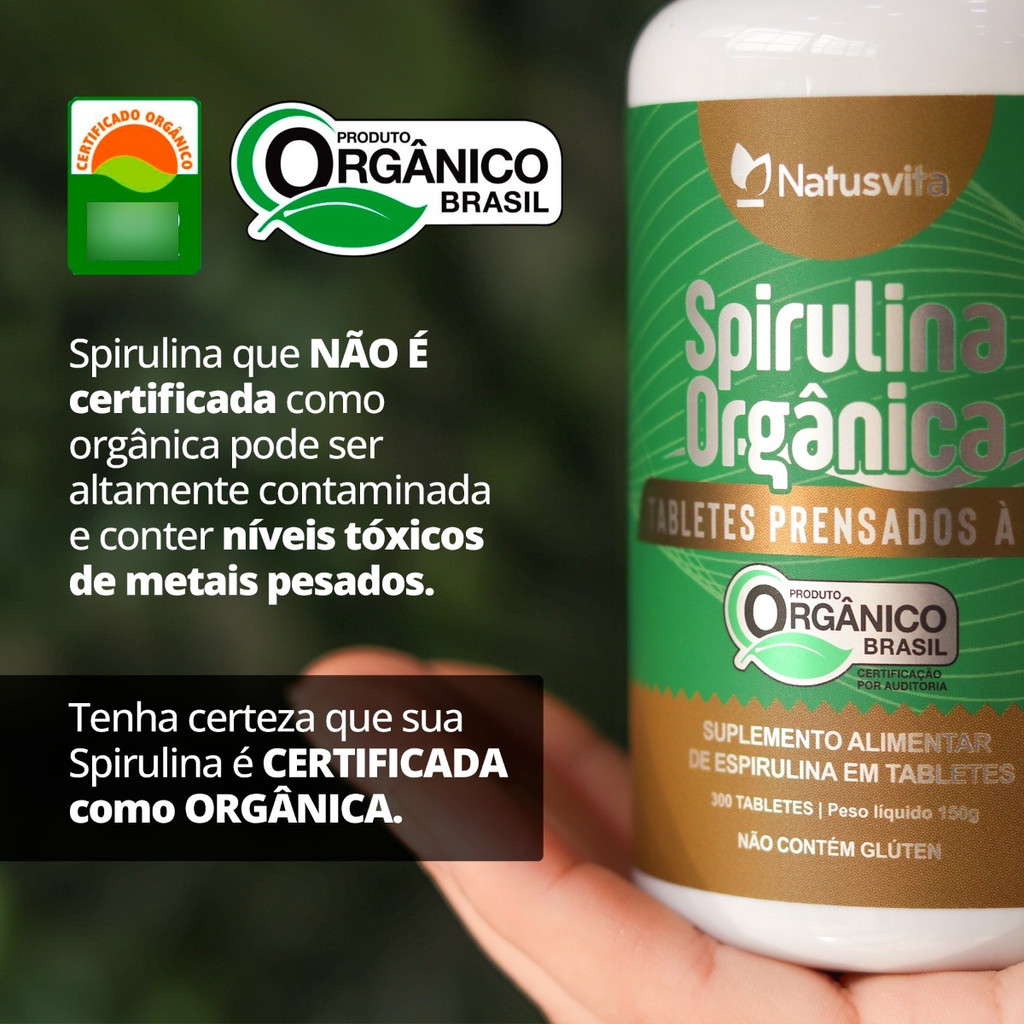 SUPER VALOR: Nossa espirulina orgânica é 100% pura e cada frasco contém 300 tabletes de 500mg. Oferecemos a Spirulina orgânica certificada mais pura e segura pelo melhor preço disponível quando comparado com outras marcas de Spirulinas Orgânicas Certificadas. CERTIFICADA COMO ORGÂNICA PELO IBD E COM SELO SISORG: Nossa espirulina orgânica atende aos rígidos padrões orgânicos do selo SISORG (Sistema Brasileiro de Avaliação da Conformidade Orgânica). Ter a certificação do IBD (Instituto Biodinâmico de Desenvolvimento, uma das principais certificadoras de produtos orgânicos na América Latina) significa não apenas que os ingredientes são orgânicos, mas também que seguimos métodos de processamento aprovados e com supervisão rigorosa. LIVRE DE CONTAMINANTES E 100% PURO: Nossa espirulina orgânica é testada por laboratório e é livre de metais pesados, herbicidas, pesticidas, fertilizantes, microcistina, nitratos, BMAA, mofo, fermento e produtos químicos. Este produto é 100% puro, sem aditivos, excipientes, aglutinantes, contaminantes, trigo, soja, glúten, ovos de leite, nozes, peixe – ou qualquer outra coisa que não seja Spirulina Orgânica! NATURALMENTE RICA COM DIVERSOS NUTRIENTES. Nossa Spirulina Orgânica é rica em proteínas veganas, enzimas, fibras, aminoácidos, flavonóides, vitaminas imunológicas (vitamina A, vitaminas do complexo B, vitamina C, vitamina K e biotina), minerais (magnésio, zinco, cálcio, potássio), Clorofila, Fitonutrientes e Antioxidantes. QUALIDADE DE FÁBRICA. CONFIÁVEL E SEGURO COM PADRÃO OURO - Sua saúde e segurança é o que mais importa. Esta é a conta Oficial da NatusVita. Este produto é produzido em nossa fábrica que segue todas as normas e protocolos da ANVISA/MS o que garante que você obtenha qualidade consistente em cada dose. Além disso, cada um de nossos lotes são testados e produzimos lotes mensais, o que permite uma validade longa para o produto que está adquirindo aqui. Modo de Uso: Ingerir de 02 a 04 cápsulas ao dia ou conforme orientação de seu médico ou nutricionista (como fonte de proteínas é possível ingerir até 28 tabletes ao dia).