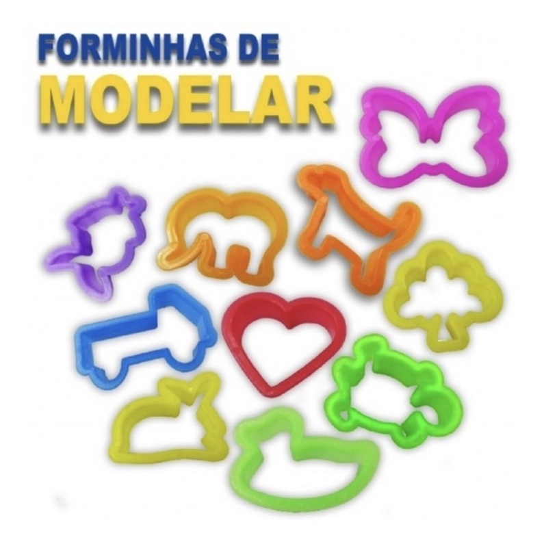 Forminha para massinha(cortadores) diversas cores e mordes, brinquedo simples mas excelente para o desenvolvimento cognitivo e aprendizado da criança! -material: plástico -tamanho:4cm -altura:1,5 cm São dez modelos diferentes como: borboleta, patinho, peixinho, tartaruga, coração, árvore, caminhão,coelho, cachorrinho e elefante.