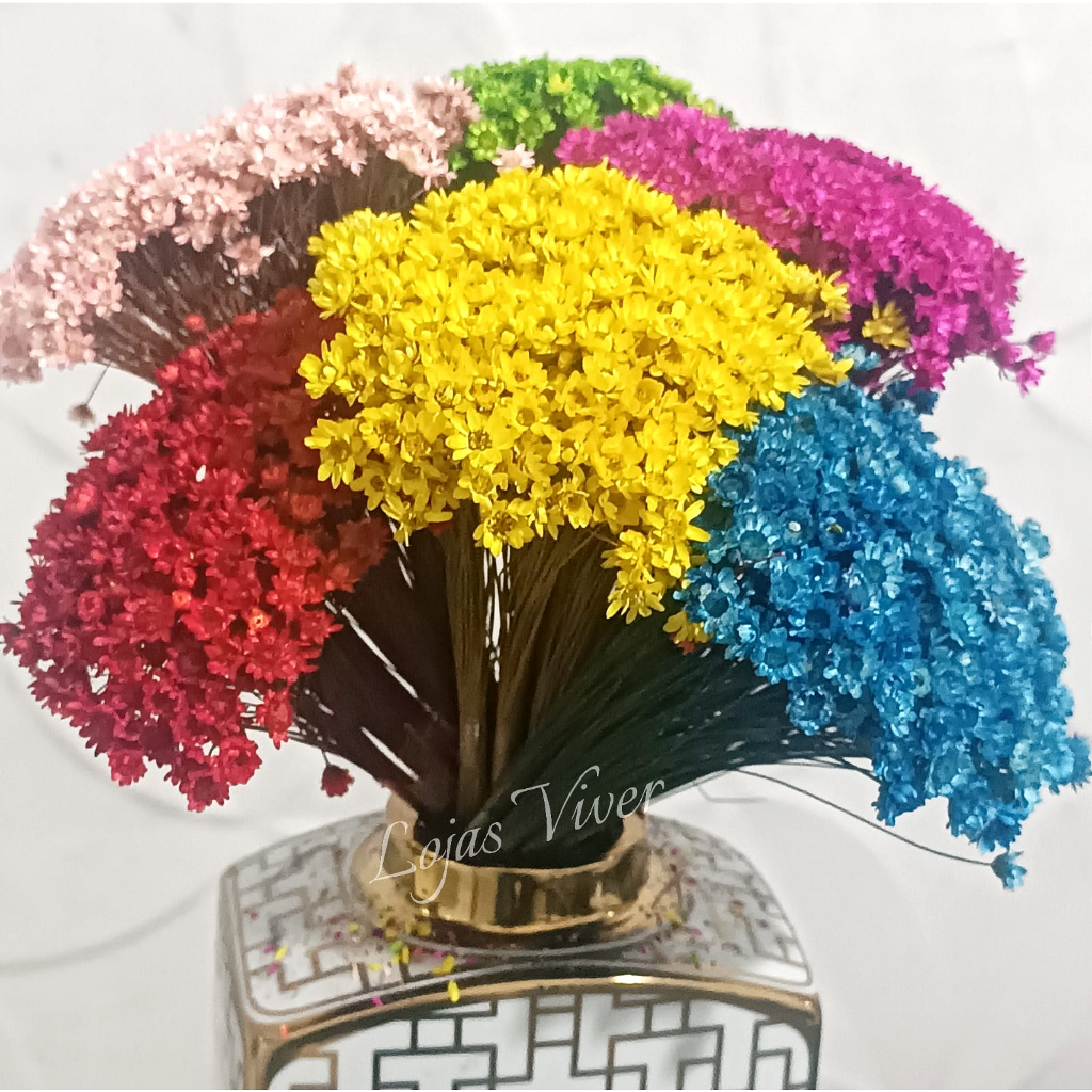O Buquê vem com Aproximadamente 300 Florzinhas Cada Buquê tem 28cm As Cores são Super vivas As flores secas são uma ótima alternativa para Buquê, Arranjos e Decorações de Casamento, Casa, Trabalho e onde mais você desejar. As Flores Sempre Vivas Desidratadas substituem as flores naturais ou até mesmo as artificiais, além disso elas não precisam de água. Elas são naturais, sofisticadas, e duram por muito tempo! Por anos Quando expostas ao Sol, elas se abrem e ficam muito mais Bonitas *Não expor a umidade As Flores Sempre Viva são Naturais. Valorize os Ambientes decorando com as Flores Sempre Vivas. Elas deixam os lugares mais Alegres, Bonitos e Aconchegantes. O Buquê contém aproximadamente 300 florzinhas de Sempre Viva Mix 6 Cores: Amarela/ Laranja/ Vermelha/ Rosa Claro/ Azul Claro/ Verde