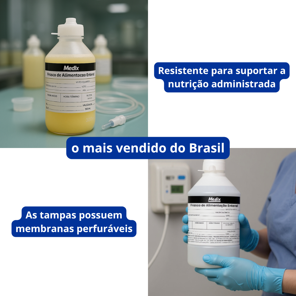 DETALHES - Produto: Frasco de Alimentação + equipo Nutrição Enteral. - Marca: Medix. - Material: Plástico. - Modelo: Alimentação enteral. - Linha: Hospitalar. - Cor Frasco: Transparente. - Cor equipo: Azul. - Tamanho Frasco: 300ml. - Tamanho Equipo: 150cm. - Contém: 30 frascos de alimentação + 30 equipos para nutrição enteral. - Registro Anvisa: Sim. - Ideal para o ambiente hospitalar. - Frasco: - Possuem graduação de 10 em 10 ml, facilitando na utilização com a necessidade do paciente. - Ideal para alimentação de pacientes impossibilitados de deglutir o alimento. - Higiênico. - Maior segurança. - As tampas possuem membranas perfuráveis. - Equipo: - Ponta perfurante com tampa protetora. - Regulador de fluxo. - Maior segurança. - Resistente para suportar a nutrição administrada. - Câmara gotejadora flexível de 48mm - Macrogotas 20gotas/ml;