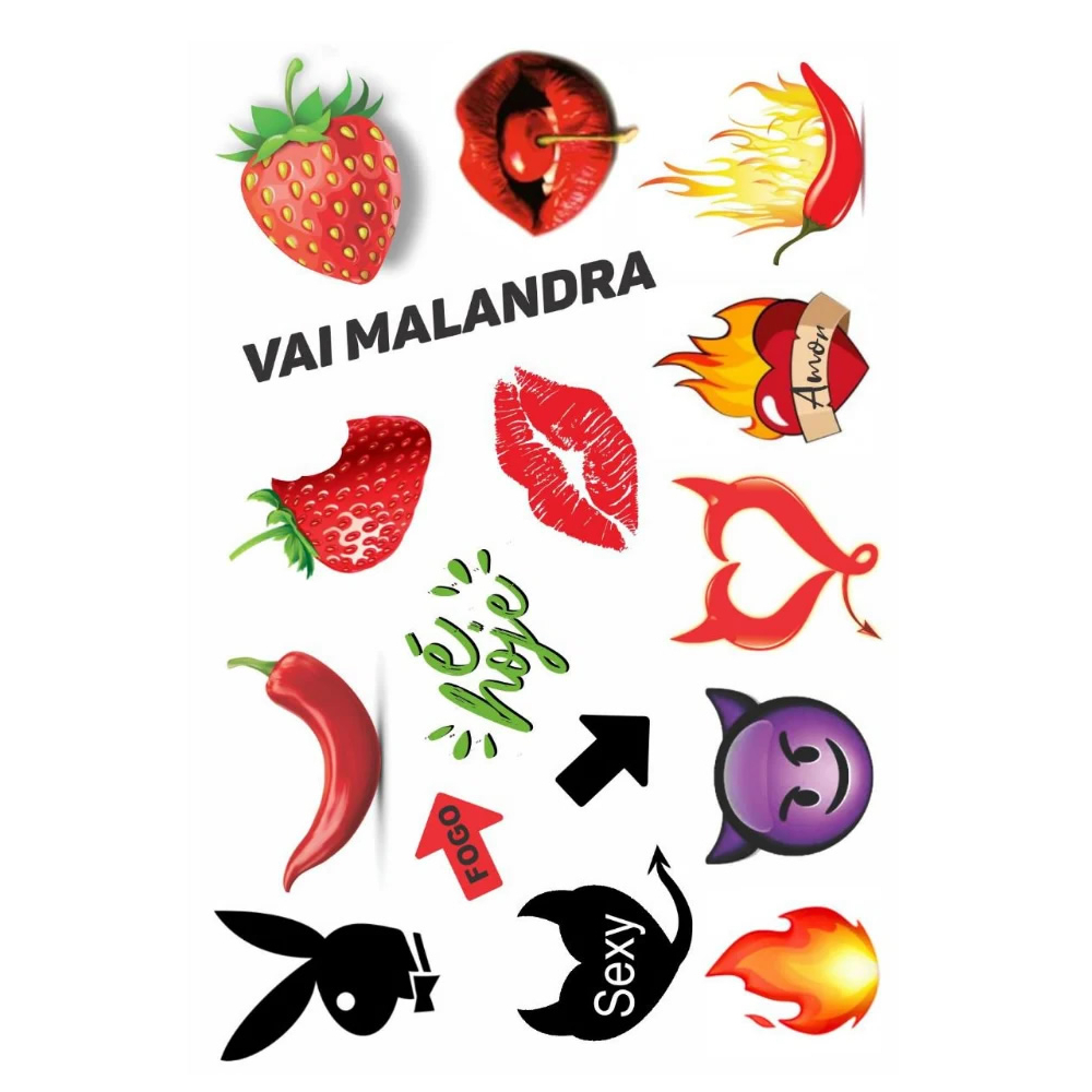32 Adesivo Tatuagem a prova de água - Tatuagem Depilação SEX SHOP Frases picantes para ir direto ao ponto com muita vontade e tesão! Às vezes temos vergonha ou receio de expressar com palavras ditas o que queremos, mas com as tatuagens temporárias esses problemas acabam em questões de segundos. Com frases quentes, picantes e com indicações diretas e retas do que precisa ser feito naquela noite, não tem erro, é garantia de sucesso e muita tesão. Perfeita para dar aquela modificada na rotina e aumentar a libido do casal, transformando uma noite comum em algo completamente especial e com diversão garantida, as tatuagens temporárias estão revolucionando o mercado erótico. Cole elas em locais estratégicos e use sua criatividade junto ao seu par. - KIT 2 CARTELAS • Dimensão de cada cartela: 10x15cm • Coberta com plástico para proteção e conservação da cola. • As tatuagens têm validade de 3 anos e devem ser armazenadas em local seco e arejado. Após aplicadas duram até 3 dias, podendo durar menos tempo dependendo da região aplicada e do contato com água/suor. Evitar atrito com a pele no local após aplicado. Recomendamos a aplicação em regiões sem ou com menos pelos. PRODUTO TESTADO E CERTIFICADO PELO INMETRO (Disponibilizamos laudos caso necessário) - Quais os benefícios dos adesivos? • Ousadia; • Criatividade; • Frases Excitantes; • Momentos quentes. INSTRUÇÕES PARA APLICAR A SUA TATUAGEM: 1 - Destaque o desenho escolhido; 2 - Retire a proteção plástica; 3 - Aplique na pele limpa e seca; 4 - Jogue água pelo verso; 5 - Retire após 30 segundos. - Como remover as tatuagens temporárias? Para remover a tatuagem temporária é tão fácil quanto colocar, com a ajuda de toalha, esponja ou até mesmo algodão, passe creme hidratante ou álcool em gel sobre a região e esfregue com cuidado e sem necessidade de força, em seguida o adesivo vai perder a fixação sob a pele e sair com facilidade. - Quais cuidados e precauções preciso ter ao aplicar a tatuagem? • Sempre faça a higienização, antes e depois do uso; • Não expor o produto a temperatura superior a 50ºC; • Remova a tatuagem adesiva com álcool em gel; • Zonas inflamadas, inchadas ou pele com lacerações, não utilizar o produto, pois pode ocorrer agravamento de patologias já existentes ou lesões. - Recomendações: • Mantenha fora do alcance de crianças; • Deixe em local fresco e arejado • Aplique em áreas sem ou com poucos pelos; ENVIO IMEDIATO EMBALAGEM DISCRETA