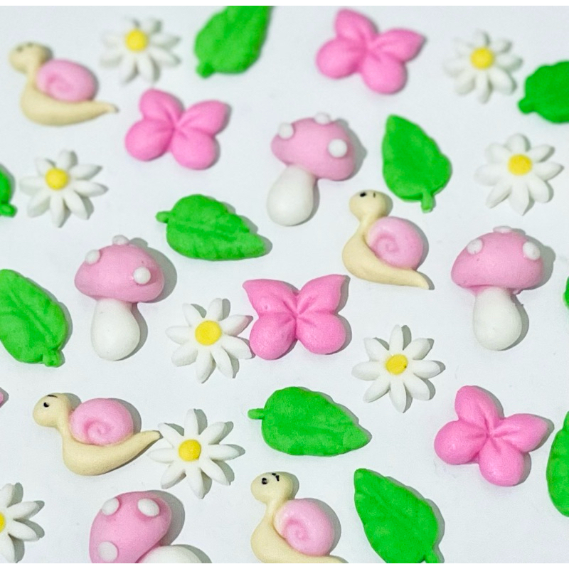 NÃO fazemos troca de modelos. tamanho entre 1cm e 2cm (fotos disponíveis) 35 unidades: 10 folhas 10 flores 5 cogumelos 5 caracóis 5 borboletas Produto totalmente comestível, feito de açúcar, glucose de milho e água. Produto personalizado validade de 180 dias dentro da embalagem de envio. * MANTER EM LOCAL AREJADO, COM POUCA UMIDADE E LUMINOSIDADE (para não perder a cor original do produto) * DE FORMA ALGUMA GUARDE O PRODUTO EM REFRIGERADOR OU FREZER)
