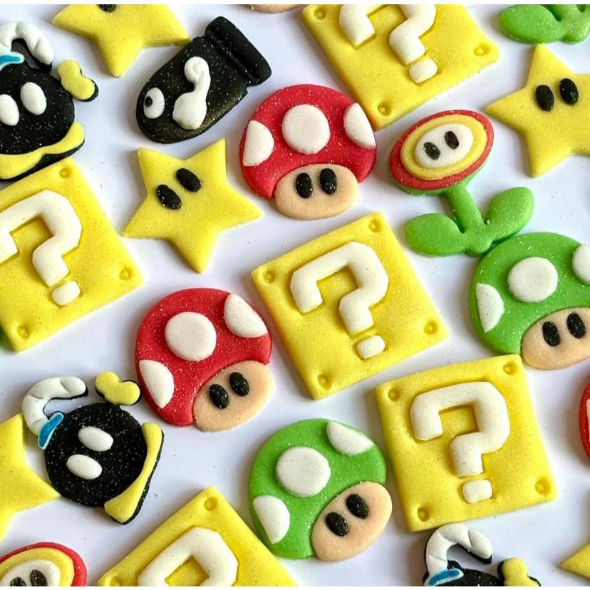 Apliques de Pasta Americana, 100% comestíveis, tingidos com corantes alimentícios. Sem opções de escolha de cores e modelos. Mix de apliques no tema Mario sortidos. Ideal para Decoração de Bolos, Chocolates, Brigadeiros, Donuts, Pirulitos, Brownie, Cupcakes e Ovos de Páscoa. Opção perfeita para agregar valor ao seu produto, Use a sua criatividade. (Não deve ser aplicado sobre o Chantilly). Por se tratar de um produto artesanal pode apresentar leves diferença de cores, tamanhos e modelos. Os apliques medem aproximadamente de 3cm a 3,5. Quantidade do produto: 35 unidades. Por segurança enviamos sempre 10% a mais do produto, caso possa ocorrer algum dano no transporte. Validade de 10 a 12 meses se armazenado da forma correta. Armazenamento: Manter em local seco, arejado e escuro. Longe de Luz forte e jamais exposto a Umidade.
