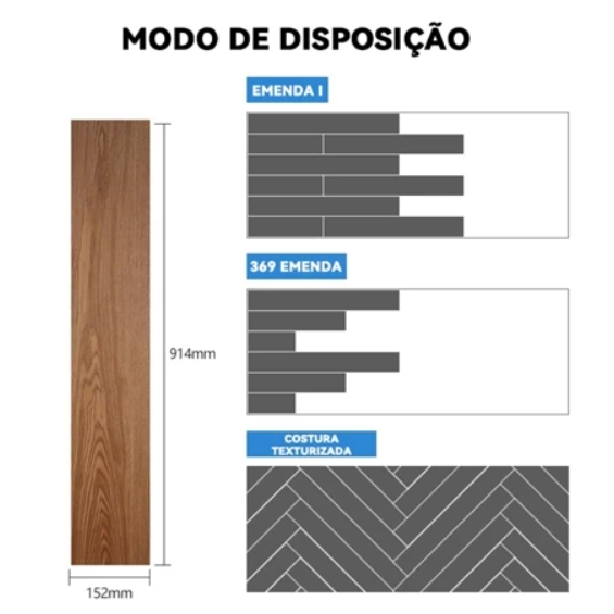>>> VALOR UNITÁRIO SAINDO APROXIMADAMENTE R$6,02<<< PISO VINÍLICO AUTO ADESIVO PADRÃO MADEIRA Beleza – Sofisticação – Praticidade – Economia Nova linha de revestimentos com padrões de madeira. Um produto incrível que pode ser usados em pisos, paredes ou tetos! Material de altíssima qualidade com textura em alto relevo. São impermeáveis e resistentes, proporcionam conforto térmico e acústico dando uma sensação de aconchego ao ambiente. Faça você mesmo!!! São muito fáceis de instalar. Transformam o ambiente em poucos minutos, sem sujeira ou odores de cola e o melhor de tudo, não precisa contratar mão de obra especializada. Para quem busca por praticidade, qualidade, sofisticação este é o produto ideal, pois tem um excelente custo-benefício. Características - Produto autocolante - Fácil Instalação - Boa durabilidade e resistência - Conforto acústico e térmico - Não propaga chamas - À prova d'água - Fácil limpeza - Imune a cupins e fungos - Tratamento antibacteriano - Hipoalergênico - Proteção UV - Acabamento de alta qualidade - Estética de madeira natural > Ficha técnica - Material: PVC (Policloreto de Vinila) - Padrão: Régua madeira - Dimensões: 91,5cm x 15,3cm - Espessura: 1,5mm - Capa de uso: 18mm - Classificação de uso: Residencial moderado - Rendimento: 0,14 m2 / régua 1 UNIDADE = 1 ADESIVO SELECIONADO não TAMANHO 91, 4 x 15, 2 cm >>> Como saber quantas unidades comprar? 1-Multiplique o tamanho do espaço para saber os metros quadrados (comprimento x largura) 2-Divida esse valor por 0,139 Como Instalar: 1. Limpe: Limpe as superfícies e remova a poeira. 2. Aplicação: Para começar, retire a película da placa aplique o adesivo iniciando nos cantos. Destaca-se que deve ser retirada a película conforme for realizada a aplicação EXEMPLO: 1) SALA 2,5m x 2m = 5m quadrados 2) 5m dividido por 0,139 = 36 placas Observação: 1 caixa de 36 Pisos.