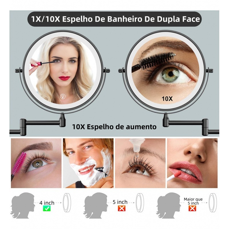 Espelho de lupa de toque inteligente O nosso espelho de vaidade apresenta um design de sensor de tela sensível ao toque de alta sensibilidade: Toque no interruptor do sensor para ligar / desligar a luz. O toque curto novamente para selecionar luzes coloridas. Segure o botão por um segundo pode ajustar o brilho. Braço extenível chique O braço do espelho pode ser dobrado e estendido, o que é muito adequado para uso em espaços estreitos. O mesmo volta contra a parede será economizando molho após o uso. 360 ° Rotação sem rotação Este espelho de banheiro pode ser girado 360 graus, é fácil para você encontrar o ângulo de visão confortável conforme necessário. Escurecimento sem passos Com um design de sensor de tela sensível ao toque de alta sensibilidade, você pode clicar no botão uma vez para ligá-lo e clicar rapidamente no botão para desligar. Pressione longamente para ajustar o brilho da luz (pressione e segure para ajustar o brilho da luz (livremente ajustável de 1% a 100%) conforme sua necessidade Dois métodos de instalação *Equipado com adesivo sem pregos: Não há necessidade de fazer furos para instalar em qualquer superfície lisa. *Instalação perfurável: Acompanha parafusos, adequados para instalação em todas as superfícies. Escurecimento contínuo e iluminação de 3 cores Espelho de maquiagem iluminado de 8 polegadas adota 54 contas de LED personalizadas projetadas com base na renderização da cor da pele, que imita a luz natural do dia em até 97% para refletir as cores realistas da maquiagem. Este espelho de penteadeira oferece luzes brancas, luzes quentes e luzes frias, você pode aplicar 3 configurações diferentes para diferentes efeitos de luz, luz branca para maquiagem diária de escritório ou normal, luz quente para maquiagem de festa ou clube, luz natural para maquiagem de encontro ou ao ar livre. Fácil de alterar o modo de luz com um único toque no botão e pressão longa para ajustar o brilho para atender às suas necessidades. Espelho de parede de dupla face de 8 polegadas Este espelho ampliado iluminado atualizado tem 8 polegadas de tamanho grande e dupla face com ampliação de 1X/10X. O espelho iluminado de alta definição 1X para sua maquiagem facial geral. Você pode trocar pelo espelho de beleza com aumento de 10X na parte de trás para mostrar detalhes do seu rosto ao aplicar delineador, sobrancelhas ou batom, é perfeito para maquiagem delicada. Mantenha uma distância de 4 polegadas ao usar o espelho de aumento iluminado de 10x para evitar tonturas. Design extensível giratório de 360° O espelho de parede iluminado com braço extensível permite que você fixe seu espelho na posição ideal para uma visualização perfeita. Ajuste o braço em qualquer ângulo que desejar. Você pode dobrar o espelho na parede para economizar espaço quando não estiver usando. Espelho de parede LED recarregável Este espelho de maquiagem de parede atualizado possui bateria de lítio recarregável de 2500 mAh, cabo tipo C incluído. Não é necessário colocar baterias. O recurso mais exclusivo é que ele é recarregável, então não há fios feios em suas paredes! Modo de economia de energia Após meia hora, o espelho de maquiagem desligará automaticamente para economizar energia. Fácil instalação Nosso espelho de penteadeira de banheiro com luzes é muito simples de instalar. Todas as informações de instalação você pode encontrar nas fotos . Você pode usar os parafusos para instalá-lo. Certifique-se de que todos os acessórios estejam completos antes de iniciar a instalação. A base de montagem na parede pode ser montada em quase qualquer superfície simplesmente parafusando. Acessórios do produto: 1. Cabo de carregamento USB: certifique-se de que seu espelho de maquiagem sempre mantenha energia suficiente. 2. Acessórios de instalação: Equipados com cola sem pregos e acessórios de perfuração, podem ser instalados em qualquer superfície. 3. Instruções de uso: Guia detalhado sobre como operar o espelho de maquiagem e seus acessórios para que você possa começar facilmente.