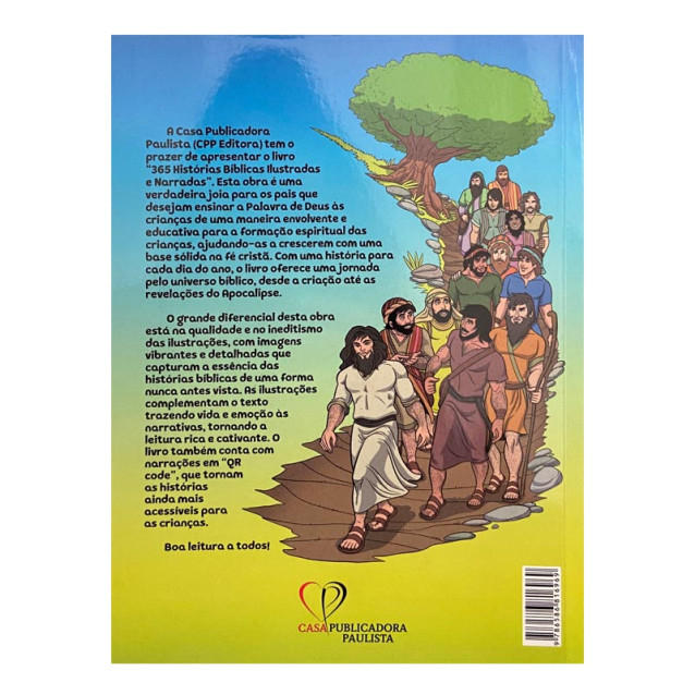 365 Histórias Bíblicas | Ilustrada e Narradas Esta obra é uma verdadeira joia para os pais que desejam ensinar a Palavra de Deus às crianças de uma maneira envolvente e educativa para a formação espiritual das crianças, ajudando-os a crescerem com uma base sólida na fé cristã. Com uma história para cada dia do ano, o livro oferece uma jornada pelo universo bíblico, desde a criação até as revelações do Apocalipse.Além disso, as páginas do livro possuem QR codes, permitindo o acesso à narração das histórias, proporcionando uma experiência interativa e imersiva para os pequenos leitores, tornando o aprendizado ainda mais dinâmico e acessível. Título: 365 Histórias Bíblicas Ilustradas e Narradas Autor: CPP Editora Páginas: 384 Capa: Brochura Tamanho: 14,5x20cm Idioma: Português