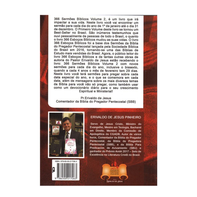 366 Sermões Bíblicos Volume 2 é um livro que irá impactar a sua vida. Neste livro você vai encontrar um sermão para cada dia do ano de 1º de janeiro até o dia 31 de dezembro. O Primeiro Volume deste livro se tornou um Best-Seller no Brasil. São inúmeros testemunhos que se ouviram. O livro 366 Esboços Bíblicos foi a base dos Sermões da Bíblia do Pregador Pentecostal lançada pela Sociedade Bíblica do Brasil em 2016, tornando-se umas das Bíblias de Estudo mais vendidas no Brasil. Agora, o público leitor do livro 366 Esboços Bíblicos e de tantas outras obras de autoria do Pastor Erivaldo de Jesus estão recebendo o livro 366 Sermões Bíblicos Volume 2 com novos sermões para cada dia do ano, inclusive o bissexto, quando a cada 4 anos o mês de fevereiro tem 29 dias.Neste livro há sermões para pregar sobre cada data especial do ano, e o que se comemora em cada data, além de mensagens sobre os mais diversos temas da Bíblia para não só pregar, como também usar como um devocionário diário para o seu crescimento espiritual e ministerial.366 Sermões Bíblicos Volume 2 é um livro que irá impactar a sua vida. Neste livro você vai encontrar um sermão para cada dia do ano de 1º de janeiro até o dia 31 de dezembro. O Primeiro Volume deste livro se tornou um Best-Seller no Brasil. São inúmeros testemunhos que se ouviram. O livro 366 Esboços Bíblicos foi a base dos Sermões da Bíblia do Pregador Pentecostal lançada pela Sociedade Bíblica do Brasil em 2016, tornando-se umas das Bíblias de Estudo mais vendidas no Brasil. Agora, o público leitor do livro 366 Esboços Bíblicos e de tantas outras obras de autoria do Pastor Erivaldo de Jesus estão recebendo o livro 366 Sermões Bíblicos Volume 2 com novos sermões para cada dia do ano, inclusive o bissexto, quando a cada 4 anos o mês de fevereiro tem 29 dias.Neste livro há sermões para pregar sobre cada data especial do ano, e o que se comemora em cada data, além de mensagens sobre os mais diversos temas da Bíblia para não só pregar, como também usar como um devocionário diário para o seu crescimento espiritual e ministerial. 16X23CM 756 Páginas