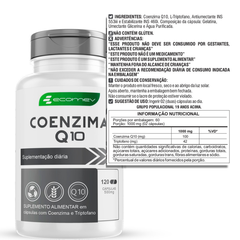 3x Coenzima Q10 + L-Triptofano 360 caps Ubiquinol 100% de Absorção Ecomev