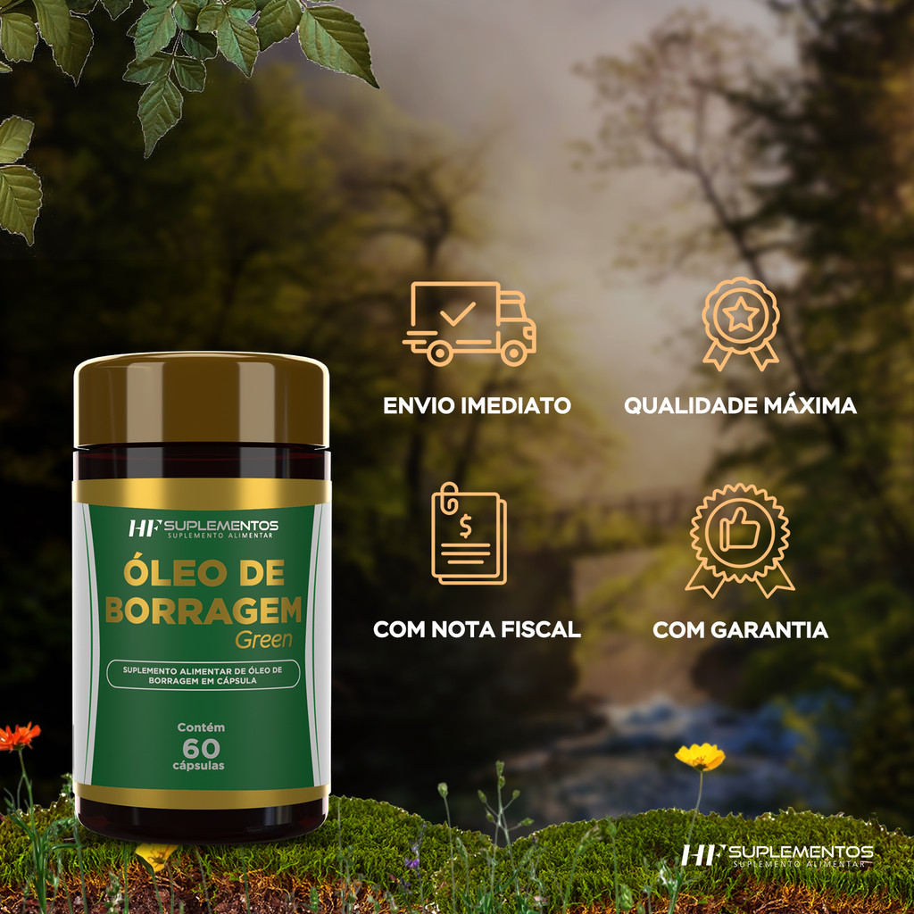 Suplemento Alimentar de Óleo de Borragem em cápsula. Pote com 60 Cápsulas INGREDIENTES: Óleo de Borragem. COMPOSIÇÃO DA CÁPSULA: Gelatina, água purificada e umectante glicerina. NÃO CONTÉM GLÚTEN NÃO CONTÉM LACTOSE ESTE PRODUTO NÃO DEVE SER CONSUMIDO POR GESTANTES , LACTANTES E CRIANÇAS. RECOMENDAÇÃO DE USO: Ingerir 2 Cápsulas ao dia. Dispensado de Registro no Ministério da Saúde conforme RDC 240 DE 26/07/2018. Através deste anúncio, você está adquirindo 3 (três) Potes de 3X OLEO DE BORRAGEM GREEN HF SUPLEMENTOS 60 CAPS