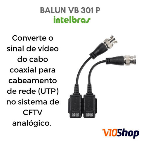 Bem vindo(a) a V10 SHOP !! MATERIAL COM NOTA FISCAL Este kit contém 4 Baluns passivos com transmissão de vídeo VB301P Proteção contra surtos de tensão Filtro contra interferência e ruídos Conector com parafuso Conector BNC macho Categoria do cabo UTP: 5 ou superior Compatíveis com o formato de vídeo NTSC Compatíveis com as tecnologias HDCVI / AHD/ HDTVI / Analógico (CVBS). Especificações técnicas Conexões Entradas de vídeo 1 BNC Saídas de vídeo 1 borne com parafuso Compatível com áudio Sim¹ Vídeo Protocolo de vídeo HDCVI / AHD/ HDTVI / Analógico (CVBS) Formato de vídeo NTSC Alcance do cabeamento com tecnologia HDCVI 250 metros (720p), 150 metros (1080p)² Alcance do cabeamento com tecnologia AHD 200 metros (720p) , 100 metros (1080p)² Alcance do cabeamento com tecnologia HDTVI 200 metros (720p), 100 metros (1080p)² Alcance do cabeamento com tecnologia Analógica (CVBS) 400 metros Filtro contra ruídos e interferências Sim Impedância cabo UTP 100 RJ45 Impedância cabo coaxial 75 BNC Características Complementares Compatível com dados (menu OSD e PTZ) Sim Características Elétricas Proteção antissurto vídeo 8 kV (modo comum), 1,5 kV (modo diferencial) Norma de proteção antissurto Pulso 10-700Us IEC 61000-45 modo diferencial Características Mecânicas Dimensões (L × A × P) 30 x 16 x 15 mm Peso 39 g Cor case Preto Tipo case / material Plástico Local de instalação Interno Características Ambientais Temperatura de operação -10 °C a 55 °C