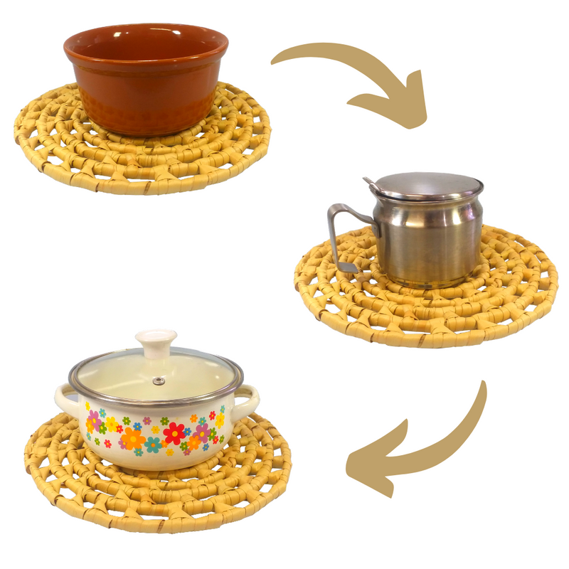 Kit com 4 Descansos De Panela Redondo Em Palha Rústico 20 cm Fabricado em Palha, durável e perfeito para o dia a dia. Proteja sua mesa ou toalhas com o Descanso de Panela evitando que queimem ao entrar em contato direto com panelas quentes. Possui furos para pendurar Atenção: Não colocar diretamente sobre o fogo ou grelha do fogão! Diâmetro: 20cm