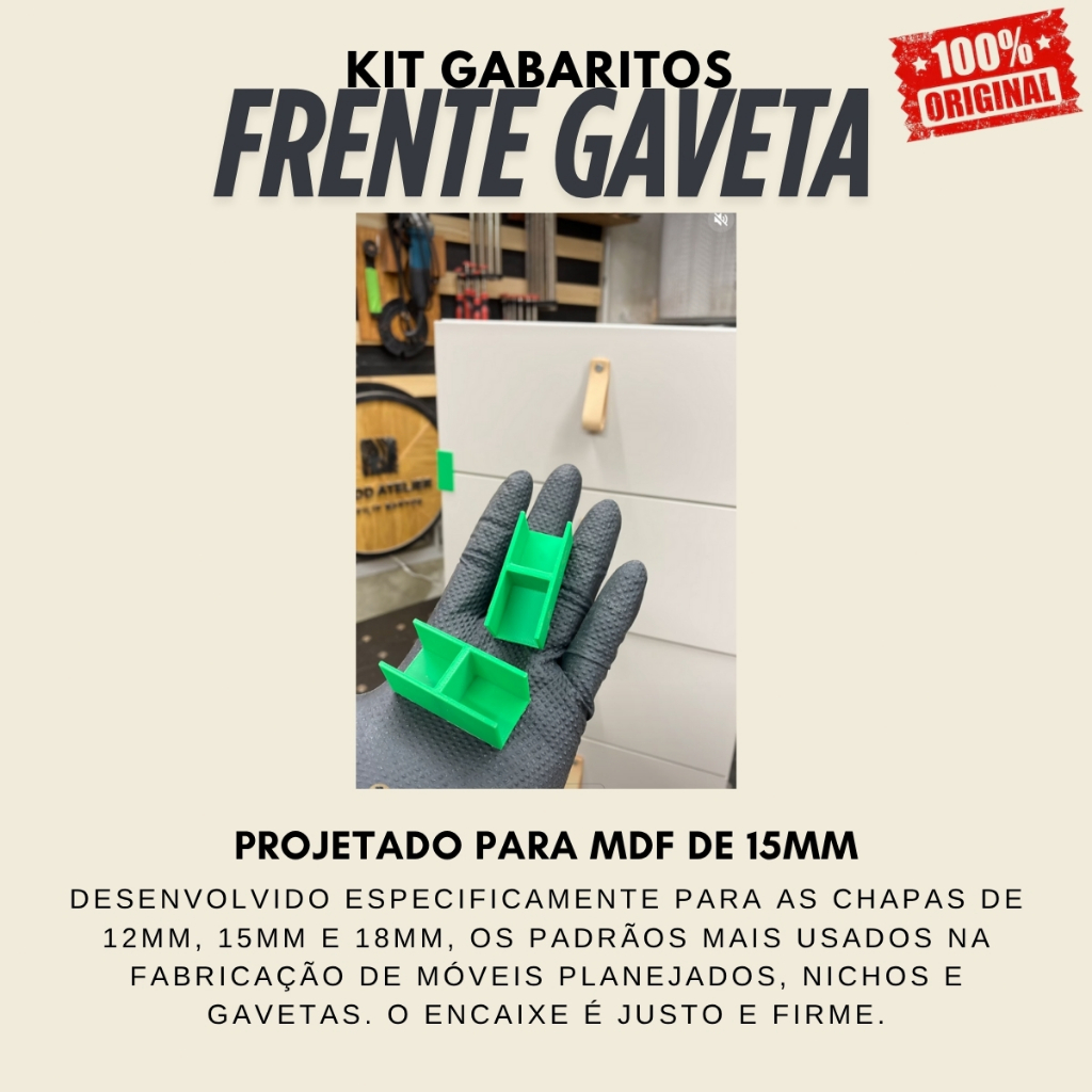 Kit 4 Calços Espaçadores para Montagem de Frente de Gaveta - ZELOK Diga adeus à frustração de frentes de gaveta desalinhadas! Com os Calços Espaçadores da ZELOK, você garante um espaçamento perfeito e consistente, além de manter a frente da gaveta no lugar enquanto alinha e parafusa. Uma ferramenta simples que traz um resultado profissional! // BENEFÍCIOS E DIFERENCIAIS // ALINHAMENTO PROFISSIONAL: Garante um espaçamento lateral uniforme de 2mm ou 3mm (design 2 em 1), proporcionando um acabamento limpo e simétrico ao seu móvel. MÃOS LIVRES PARA TRABALHAR: O gabarito "morde" a lateral do gabinete e segura a frente da gaveta para você, liberando suas mãos para o alinhamento fino e a fixação dos parafusos. VERSATILIDADE TOTAL: Projetado para funcionar perfeitamente com as espessuras de MDF mais comuns do mercado (12mm, 15mm e 18mm). KIT PEÇAS: Ideal para travar os cantos de uma gaveta grande ou trabalhar em duas gavetas simultaneamente, garantindo máxima precisão e agilidade. MATERIAL ROBUSTO: Fabricado em PETG Premium, um polímero de alta resistência, garantindo que a peça não deforme e possa ser usada em inúmeros projetos. // ATENÇÃO - COR VARIÁVEL // As cores dos gabaritos são sortidas e enviadas aleatoriamente conforme a disponibilidade em nosso estoque. // ESPECIFICAÇÕES TÉCNICAS (POR PEÇA) // Material: PETG Premium Dimensões (A x C x L): 5,2 cm x 1,7 cm x 1,5 cm Peso (por peça): 86 g // O QUE VOCÊ RECEBE // Kit contendo Calços Espaçadores para Frente de Gaveta ZELOK ***ENVIO IMEDIATO*** Não perca a chance! Garanta já o seu e leve duas ferramentas pelo preço de uma. Palavras Chaves de Pesquisa: Gabaritos para Montagem de Móveis Gabaritos para Montagem de Nichos Gabaritos para Montagem de Gavetas Gabarito para Montagem de Móvel Gabarito para Montagem de Nicho Gabarito para Montagem de Gaveta Gabaritos para Gavetas Gabaritos para Móveis Gabaritos para Nichos Gabarito Móvel Nicho Gaveta