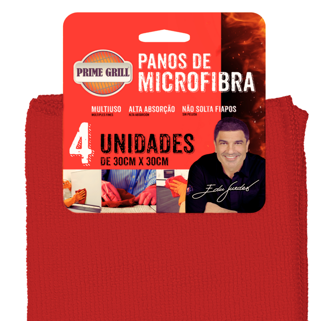 PANOS DE MICROFIBRA PIME GRILL - COM 4 UNIDADES - NA COR VERMELHA MULTIUSO ALTA ABSORÇÃO NÃO SOLTA FIAPOS MEDIDAS: 30 X 30 CM INDICADOS PARA LIMPEZA DE GELADEIRAS, INOX, VIDROS E QUALQUER SUPERFÍCIE LISA. SUA UTILIZAÇÃO EVITA RISCOS. COLEÇÃO EDU GUEDES PRIME GRILL