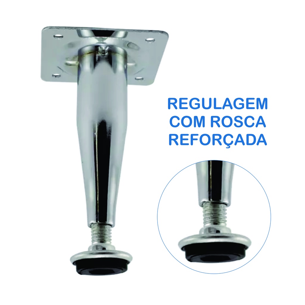 Kit 4 Pé 10cm para Moveis Cromado Os pés cônicos são suportes desenvolvidos para manter a estrutura do móvel segura e estável, aumentando a vida útil do mesmo.Possuindo um sistema de regulagem de altura, permite maior controle de estabilidade nivelando os móveis até mesmo em pisos irregulares. FÁCIL INSTALAÇÃO: Por ser fixação por parafusos na base quadrada do topo, é muito fácil instalar! ESPECIFICAÇÕES:Altura sem regulagem: 100mm (10cm)Altura máxima regulagem: 110mm (11cm)Largura: 25mm (2,5cm)Acabamento: CromadoTamanho da chapa: 60x60mm (6x6cm)Base: chapa 4 furos para fixação • • • • • Nuve de Tags: Armários, racks, balcões, estantes, cozinha pré-moldada, mesa de centro, mesa de cabeceira, balcão para pia.