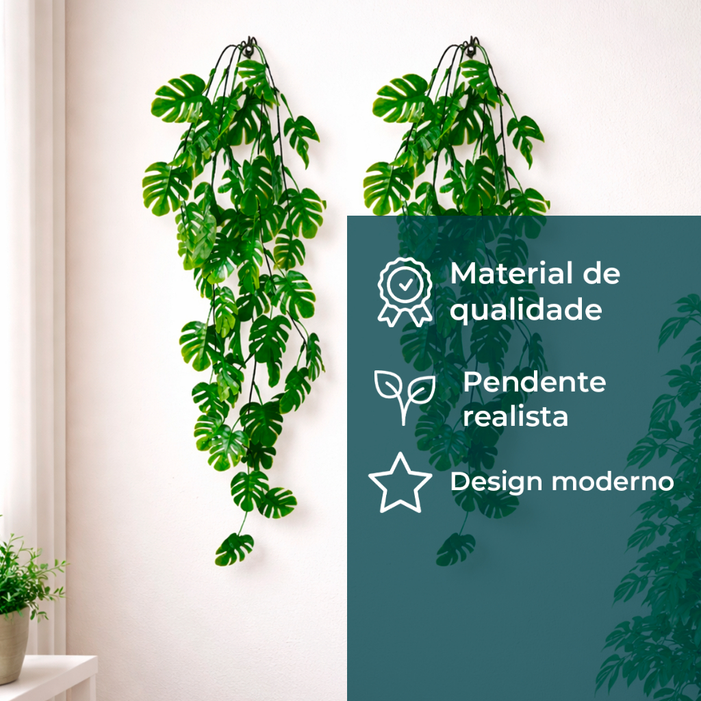 Pendente Costela de Adão Linha Premium Descrição do Produto: O conjunto de pendentes Costela de Adão da Linha Premium é uma escolha sofisticada e elegante para decorar o seu ambiente. Com 75 centímetros de comprimento, esses pendentes são de tamanho grande, proporcionando uma presença marcante em qualquer espaço. Características: Proteção UV: Resistente a áreas internas e externas, calor e frio, garantindo durabilidade. Pendentes Artificiais Premium: Costela de Adão cheia, da Linha Luxo, com armação e folhas. Resistência UV: Adequado para ambientes abertos e fechados, resistente aos raios ultravioleta. Folhagem Antialérgica: Seguro para pessoas alérgicas, proporcionando um ambiente saudável. Ramos Bem Preenchidos: Novo modelo mais preenchido, oferecendo uma aparência exuberante. Leve e Fácil de Transportar: Ideal para movimentação e transporte sem esforço. Fácil Manuseio: Novo modelo mais volumoso, com pontos de encaixe para instalação simplificada. Pendente de Ramos: Adorna seu espaço com elegância e charme. Comprimento: 75 cm. Nota Fiscal e Envio Rápido: Produto original com nota fiscal garantida. Envios no mesmo dia para sua comodidade e satisfação. Adquira agora mesmo o conjunto pendentes Costela de Adão Linha Premium e transforme seu ambiente em um espaço sofisticado e acolhedor.