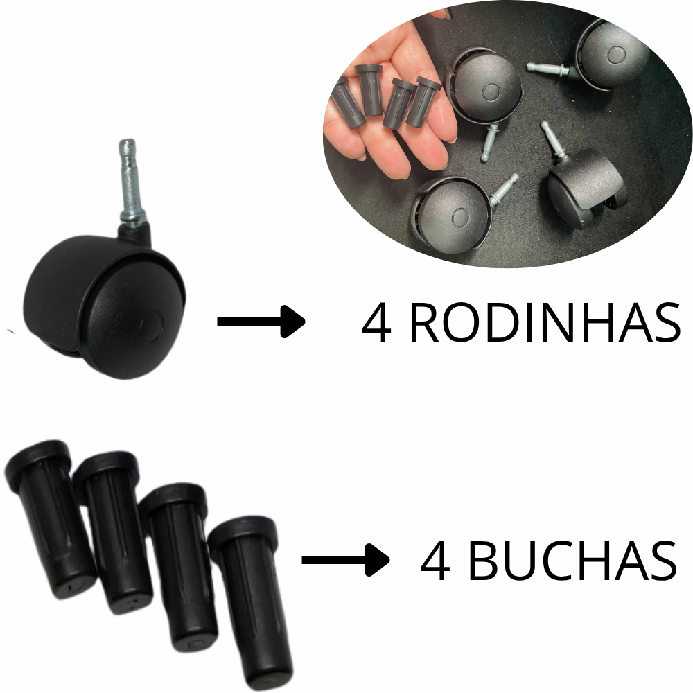 4 rodinhas de 50mm Pino 10mm + Bucha De 1/2 - MÓVEIS NO GERAL Roldana 50 mm diâmetro Rodízio de plástico com pino de 10mm e bucha para tubo de 1/2 e roda dupla. Possui alta qualidade e ótimo acabamento. Peça Ideal para cômodas, puffs, decoração, artesanato, cadeira de manicure , móveis de escritório, etc.. Capacidade de carga 30 Kg por peça Observação: as buchas vão soltas, você cliente, fará fixação quando for realizar a instalação.