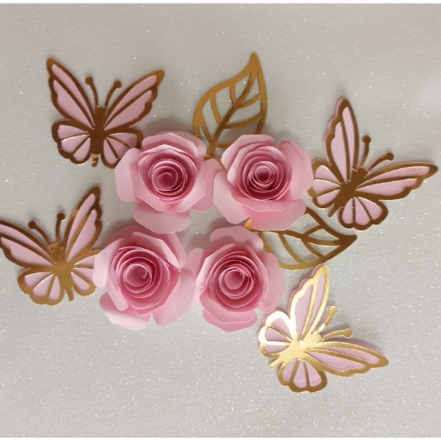 4 rosetas e 4 borboletas para topo de bolo flor 3d rosa