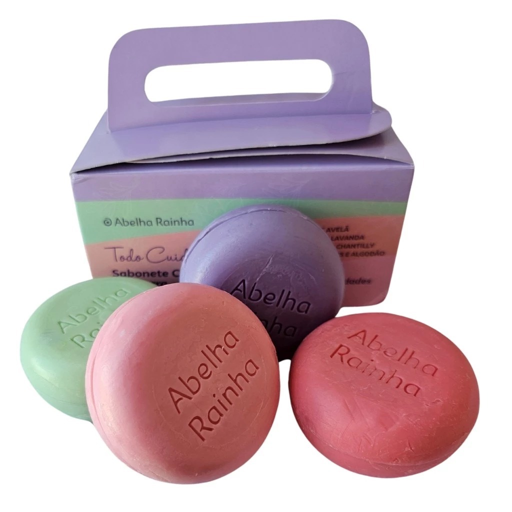 4 Sabonetes Barra Todo Cuidado + Abelha Rainha 90g cada - Cuide com carinho: A caixa de sabonetes perfeita para mimar alguém especial! Finalidade: A Caixa Presenteável contém 4 sabonetes cremosos a base vegetal, enriquecido com Manteiga de Karité e oferecem todo cuidado para usa pele. Com uma espuma cremosa e envolvente, promove limpeza e hidratação, sem agredir ou ressecar. Além de perfumar, proporcionam uma deliciosa sensação de maciez, transformando seu banho em um momento especial. Composição: cocamide DEA, sodium lauryl sulfate, cocoyl methyl glucamide, Talc, butyrospermum parkii butter, titanium dioxide, parfum, magnesium chloride, methylchloroisothiazolinone, PPG-5-ceteth-20, aqua, glycol distearate, coco glucosede, glyceryl oleate, glyceryl stearate, benzoic acid, sodium palmate, sodium stearate, sodium palm kernelate, glyccerin, sodium chloride, sodium hydroxide, pigment blue CI 74160, disodium distyrylbiphenyl sidulfonate, tetrasodium edta, etidronic acid, sodim laureth sulfate, phenoxyethanol. Pode conter: gossypium herbaceum seed extract, fragaria vesca fruit extract, CI 60730, CI 16255, CI 12490, benzyl salicylate, coumarim, hexyl cinnamal, limonene, linalool, citral, citronellol, hydroxycitronella. Modo de Uso: Aplique o sabonete sobre a pele umedecida e massageie suavemente até formar espuma. Em seguida, enxágue abundantemente. Restrições de uso: Não ingerir. Em contato acidentar com os olhos, lave imediatamente. Suspenda o uso em caso de irritação. Cuidados: Mantenha fora do alcance de crianças, proteja o produto do calor e luz excessiva. Composição: 4 Unidades de 90g / cada. 1 Alecrim e Lavanda: Sabonete cremoso com fragrância suave e refrescante. 1 Flor de Lótus e Algodão: Sabonete cremoso com fragrância confortável e floral. 1 Morango e Chantilly: Sabonete cremoso com fragrância adocicada e cremosa. 1 Cereja e Avelã: Sabonete cremoso com fragrância envolvente e suculenta.