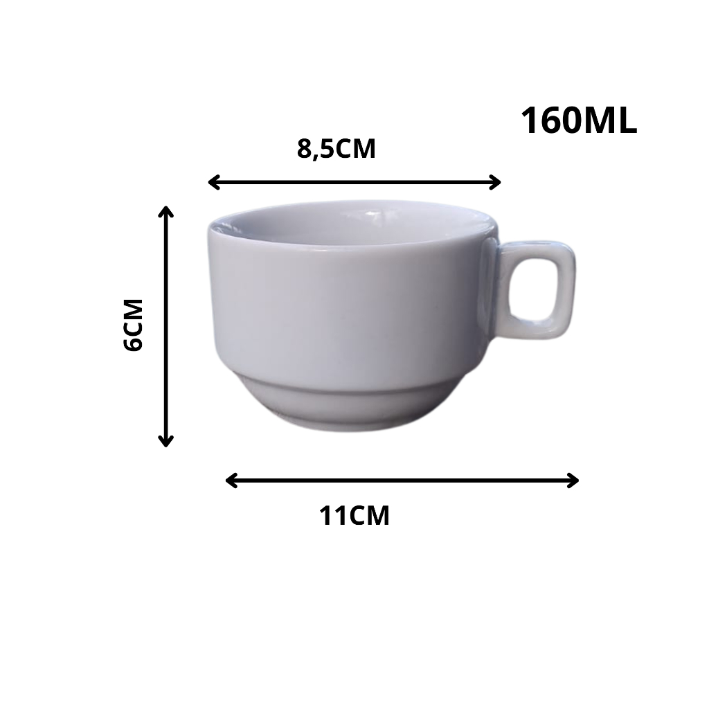 Ideal para servir bebidas quentes com elegância e praticidade. Seu formato tradicional e robusto foi pensado para ambientes com alto fluxo, como cafeterias, hotéis e restaurantes, mas também é perfeito para uso doméstico. Fabricadas em porcelana, suportam o uso constante, além de manter a temperatura das bebidas por mais tempo. Material - Porcelana branca - Acabamento clássico e funcional Aplicações - Ideal para hotéis, pousadas, restaurantes e cafeterias - Uso doméstico no dia a dia ou para ocasiões especiais - Ótima opção para servir chá, café com leite, cappuccino ou chocolate quente Cuidados e Conservação - Pode ser levada ao micro-ondas, forno, lava-louças e freezer - Lavar com sabão neutro e esponja macia - Evitar impactos para garantir maior durabilidade Observação Importante - Este modelo não é indicado para sublimação. - Recomendado apenas para uso convencional, pois não possui tratamento ou acabamento compatível com processos de personalização térmica. Tabela de Medidas Xícara (cada unidade): - Capacidade: 160 ml - Altura: 6 cm - Diâmetro: 8,5 cm - Peso: 560 g