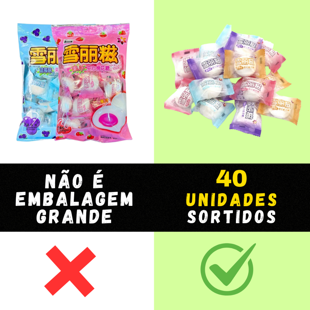 Kit de Marshmallow Recheado – A Doçura Sortida que Todo Mundo Adora! Delicie-se com nossos marshmallows macios e irresistivelmente recheados, perfeitos para um momento doce ou para compartilhar com quem você ama. Cada kit é uma seleção sortida dos melhores sabores – sempre uma surpresa gostosa! Escolha seu Kit (unidades avulsas, sabores sortidos): Kit com 40 unidades – Maior quantidade, mais diversão! Ideal para estoque, festas ou famílias grandes. Kit com 30 unidades – Doçura prolongada para você ou para compartilhar. Kit com 20 unidades – A medida certa para experimentar vários sabores. Kit com 10 unidades – Perfeito para presentear ou para uma experiência pessoal. Cada kit acompanha sabores sortidos: Uva, Morango, Chá Verde, Chocolate, Laranja e Mirtilo. Em toda compra, você recebe uma combinação surpresa e deliciosa!