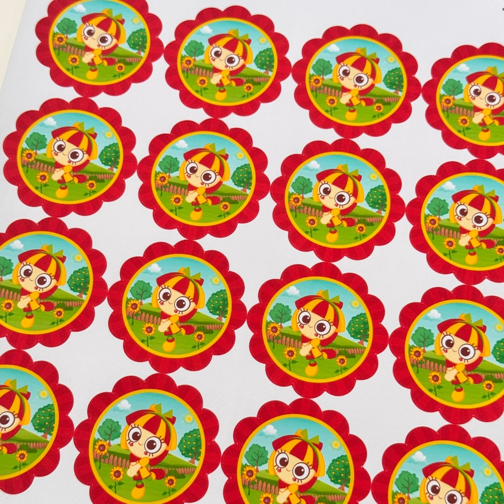 40 rótulos adesivos redondo 4,5cm tema Emília SEM NOME, rótulos FOSCO para latinhas FLOR