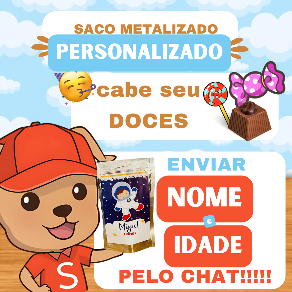 LEIA O ANÚNCIO ANTES DE COMPRAR! 👇 Saco metalizado Tamanho 12x19cm Àrea útil: 11x14 cm Personalizado na frente e metalizado atrás ❗❗❗ PRODUTO PERSONALIZADO COM A TEMA DESEJADO COM PRÉ ENCOMENDA ********************************************************************************************************* Dimensões: (Cm) = 10x17,5cm ML (valor aproximado): 220ml Pó (Peso aproximado): até 95grs Grãos (Peso aproximado): até 70grs ************************************************************************************************************ 🧡Ideal para lembrancinhas. (SUGESTÃO Coloque balas, chicletes pirulitos, bis, pipoca gourmet) ***** VAI VAZIO SEM DOCES ***** O saquinho possui o sistema zip lock (abre e fecha) 💜TAG NÃO É ENVIADA PARA APROVAÇÃO! ************************* PERSONALIZADO COM ADESIVO (SOMENTE NA FRENTE) **** METALIZADO ATRÁS *** Confeccionamos outros temas só chamar no chat. ❌❌ NÃO É IMPRESSÃO DIRETA, É ADESIVO ❌❌❌ ➡️ ATENÇÃO – APÓS CONCLUSÃO DO PAGAMENTO INFORME VIA CHAT O NOME E IDADE DA CRIANÇA. EM ATÉ 12HS, CASO CONTRÁRIO, INICIAREMOS A PRODUÇÃO SEM A PERSONALIZAÇÃO. 📌📌📌📌📌 POR FAVOR, ANTES DE FINALIZAR A COMPRA VERIFICAR SE O PRAZO DE PRODUÇÃO + PRAZO DE ENTREGA LHE ATENDE, PARA EVITAR FUTUROS PROBLEMAS DE PRAZO.