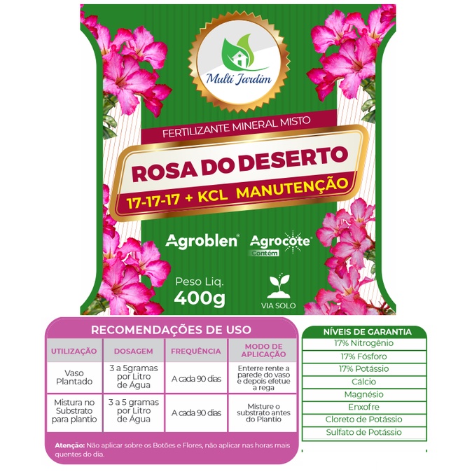 | 400gr Multi Agrocote Rosa do Deserto Adubo Fertilizante Granulado (... este produto | R$ 17,00 | — | 4.9/5 | 9 |