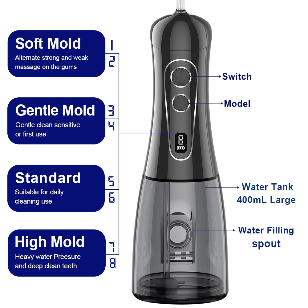 400ml Irrigador Oral Portátil IPX7 de com Jato Forte Pulsado — Inclui 5 Bicos