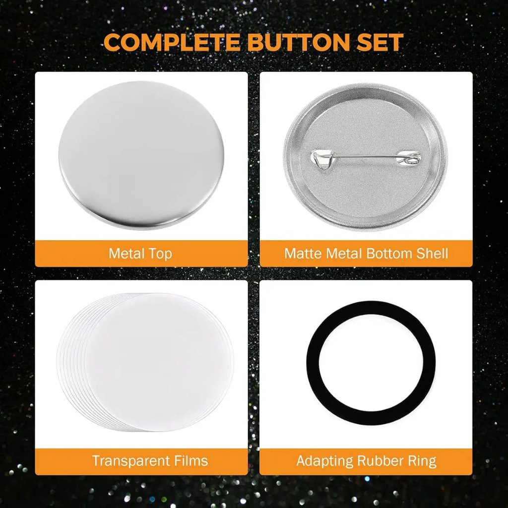 Material: Folha de flandres, plástico. Diâmetro do botão com clipe: 44 mm / 1,73 polegadas (aprox. 1-3/4 polegadas). Diâmetro do filme plástico: 54 mm / 2,13 polegadas (aprox. 2-1/8 polegadas). Tamanho de corte recomendado: 54 mm / 2,13 polegadas (aprox. 2-1/8 polegadas). Folha de flandres, plástico. Diâmetro do botão com clipe: 32 mm / 1,26 polegadas (aprox. 1-1/4 polegadas). Diâmetro do filme plástico: 44 mm / 1,73 polegadas (aprox. 1-3/4 polegadas). Tamanho de corte recomendado: 44 mm / 1,73 polegadas (aprox. 1-3/4 polegadas). Estes botões em branco em branco vêm no tamanho certo. A capa de metal mede aproximadamente 58 mm (2,28 polegadas) de diâmetro, a tampa traseira de metal mede aproximadamente 56 mm (2,2 polegadas) de diâmetro e a película transparente mede aproximadamente 70 mm (2,76 polegadas) de diâmetro. Este tamanho é ideal para criar um produto polido que se encaixará perfeitamente em suas roupas ou bolsas como uma bela decoração. MATERIAL 100% METAL: Tanto a parte superior quanto a inferior são feitas de folha de flandres, um material à prova de ferrugem, durável e resistente à deformação. A parte inferior é revestida com um material fosco, tornando-a mais confortável de usar. 100 CONJUNTOS: Cada conjunto inclui: 1 capa inferior fosca de folha de flandres, 1 capa superior de pino de folha de flandres e um pedaço de filme plástico transparente. Com este conjunto, você pode criar 100 botões com fundo de metal. As peças de metal são mais duráveis do que as de plástico. FÁCIL DE USAR: Basta imprimir imagens, fotos ou retratos em papel, cortá-los em pedaços adequados (do mesmo tamanho do filme) e criar alfinetes de botão usando uma máquina e um elástico. OBSERVAÇÃO: A máquina não está incluída. O elástico geralmente vem com a máquina. Você pode fazer os seus próprios usando papelão. AMPLA APLICABILIDADE: Você pode criar botões com diferentes padrões. Ideal para uso familiar. Você também pode montar seu próprio estande em mercados ou feiras para criar e vender botões rapidamente. Com uma câmera digital e diversas peças de botões, você pode tirar fotos e vendê-las como produtos acabados.