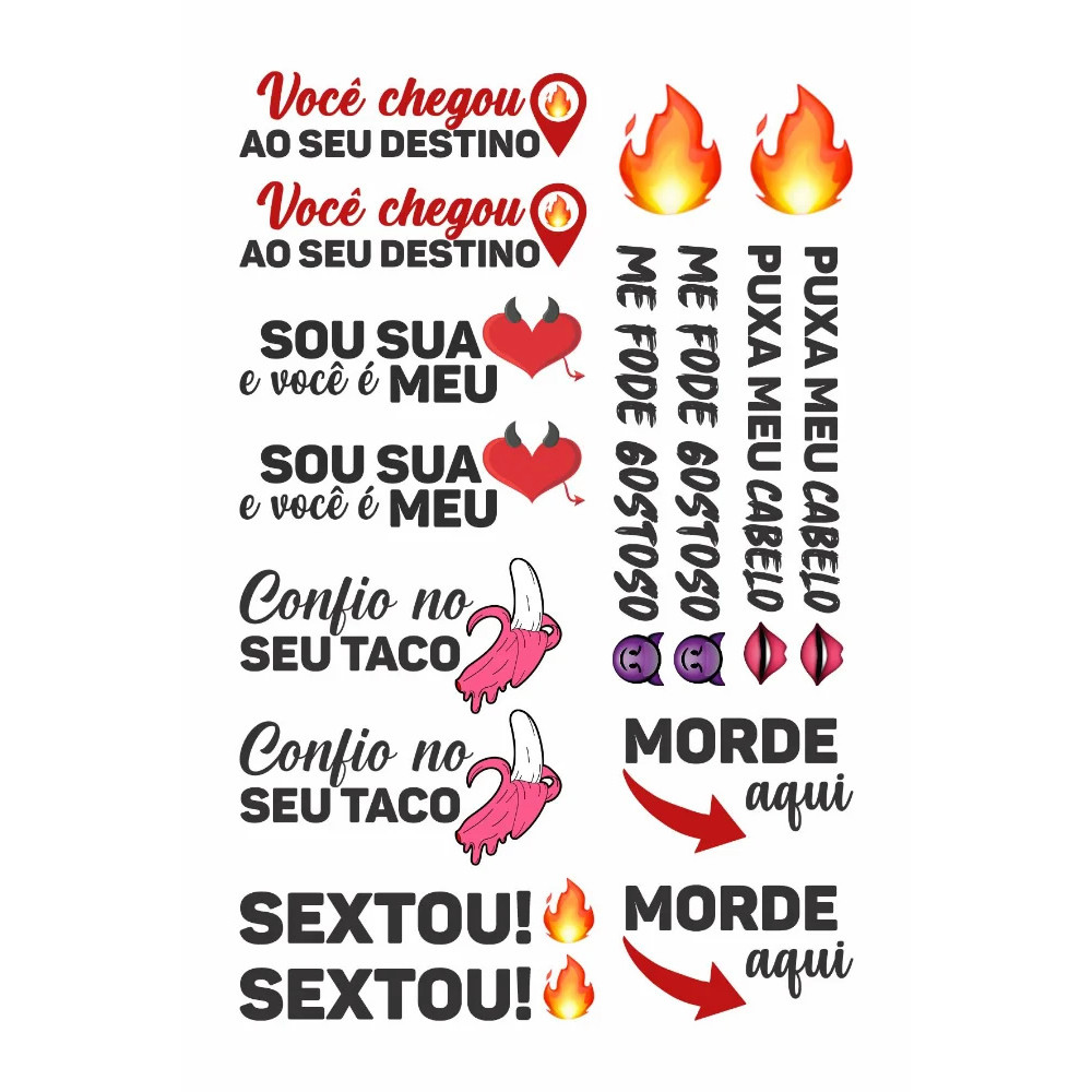 🔥 44 Tatuagens Temporárias Íntimas Pós Depilação – Frases Picantes e Sensuais 🔥 Transforme uma noite comum em uma experiência inesquecível! As Tatuagens Temporárias Sensuais são perfeitas para quem quer ousar, provocar e apimentar a relação com muito estilo, criatividade e prazer! Com frases quentes e diretas, elas falam por você e criam um clima irresistível a dois. 😈✨ ✅ Benefícios: ✔️ Frases Excitantes e Divertidas ✔️ Fácil aplicação e remoção ✔️ Aumenta a libido e quebra a rotina ✔️ Dura até 3 dias na pele ✔️ Produto testado e certificado pelo INMETRO 💌 Ideal para: Surpresas sensuais 🖤 Presentes criativos Usar em datas especiais Iniciar novas fantasias com seu par 📦 O QUE VEM NO KIT: 3 cartelas com diversas frases picantes Tamanho da cartela: 10x15 cm Total de 44 frases diferentes Cobertura plástica para melhor conservação Validade: 3 anos Embalagem discreta 🚚 🧴 COMO USAR: Destaque a frase desejada Retire o plástico protetor Aplique na pele limpa e seca Umedeça com água o verso do papel Aguarde 30 segundos e retire com cuidado ❌ COMO REMOVER: Aplique álcool em gel ou creme hidratante com algodão ou esponja e esfregue suavemente. ⚠️ Cuidados: Aplique em regiões sem ou com poucos pelos Não usar sobre pele ferida ou irritada Evitar exposição ao calor acima de 50ºC Manter fora do alcance de crianças 🎁 Envio Rápido | Embalagem Discreta | Sensualidade Garantida!