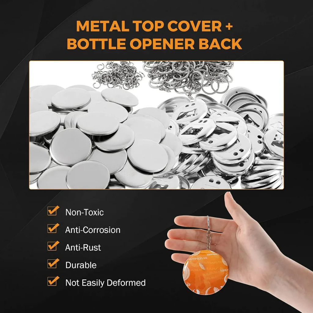 CHAVEIRO E ABRIDOR DE GARRAFAS - A parte inferior foi projetada como um abridor de garrafas com chaveiro. Mais prático de transportar e multifuncional TODOS OS SUPRIMENTOS DE METAL RENOVADOS - A parte superior, inferior e as correntes são feitas de folha de flandres, que são antiferrugem, duráveis e não deformam facilmente. CONJUNTO COMPLETO - Cada conjunto inclui 1 base de folha de flandres com corrente, 1 tampa superior de folha de flandres e um pedaço de filme plástico. Com este conjunto, você pode criar 50 chaveiros abridores de garrafas com parte traseira de metal. As partes inteiras de metal são mais duráveis do que as de plástico. FÁCIL DE OPERAR - Imprima qualquer imagem, foto ou retrato em papel, corte-os em pedaços adequados (do mesmo tamanho do filme) e faça chaveiros de botão com uma máquina de fazer botões. OBSERVAÇÃO: A máquina não está incluída. Somente máquinas com moldes especiais podem fazer esses chaveiros. AMPLA APLICABILIDADE - Chaveiros DIY com diferentes padrões. Adequado para uso doméstico. Você também pode montar seu próprio estande em mercados ou feiras, fazer e vender abridores de garrafas rapidamente. Com uma câmera digital e uma variedade de materiais, você pode tirar fotos e vendê-las como produtos acabados..