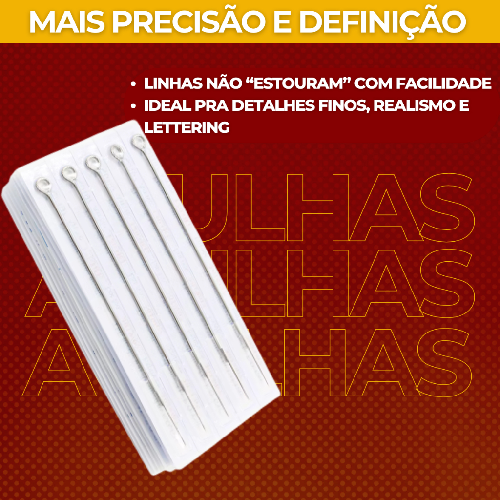 - NUMERO DO REGISTRO ANVISA STEEL FILTER: 82772649003 - NUM - SELECIONE AS MEDIDA DESEJADA ANTES DE FINALIZAR A COMRA - MARCAS: BRONC - HORNET - PHANTOM - STEEL FILTER ( ENVIADO CONFORME DISPONIBILIDADE EM ESTOQUE ) Agulhas de Alta Performance – Precisão, Segurança e Qualidade Profissional As agulhas foram desenvolvidas para oferecer máximo controle, precisão e segurança em cada procedimento. Fabricadas com aço inoxidável de grau cirúrgico, garantem resistência, durabilidade e um desempenho consistente do início ao fim da sessão. Principais benefícios: Traço preciso e uniforme: proporciona linhas limpas, sombreados suaves e melhor definição dos detalhes. Perfuração controlada: reduz o trauma na pele, favorecendo uma cicatrização mais rápida e confortável. Alta compatibilidade: projetadas para funcionar perfeitamente com os principais modelos de máquinas e cartuchos do mercado. Soldagem precisa e alinhamento perfeito: evita vibrações, falhas de tinta e retrabalho. Esterilização individual: mais segurança, higiene e conformidade com normas profissionais. Fluxo de tinta eficiente: melhora a saturação da cor e a fidelidade do pigmento na pele. Ideais para iniciantes e profissionais, as agulhas entregam confiabilidade, desempenho superior e resultados de alto padrão em qualquer estilo de trabalho.