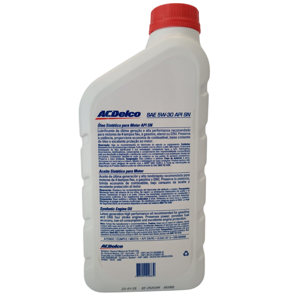 4l Oleo Sintetico Motor Sae 5w30 Api Sn Acdelco 98550168 LOJA DPC DISTRIBUIDORA DE PEÇAS CAPIVARI LTDA Somos uma empresa qualificada operando a mais de 35 anos no ramo de autopeças linha leve. Trabalhamos com grande variedade de peças automotivas, utilize o campo de perguntas para cotação! 4l Óleo Sintético Motor Sae 5w30 Api Sn Código: 4x 98550168 Marca: ACDelco Frasco Contem 1 Litro. Anuncio referente a 04 Litros. Produto novo, com garantia e nota fiscal. RECOMENDAÇÕES: - Prazo de Garantia é de 90 dias para defeitos de fabricação do produto. - A garantia expira caso seja feito um mau uso do produto ou pela má instalação, por isso recomendamos sempre que a instalação seja feita por um profissional especializado. - As fotos de nossos produtos são reais, para maior segurança para o consumidor. - Antes de efetuar a compra tire todas suas dúvidas no campo perguntas. - Mantenha seus dados e endereços atualizados - Temos carrinho de compras, adicione varios produtos e economize no Frete. - Consulte condicoes especiais para compra de mais unidades, kits ou combos. - Aceitamos devoluções apenas com a embalagem Original e Nota Fiscal. - Atendimento de segunda a sexta das 8h00 as 18h00