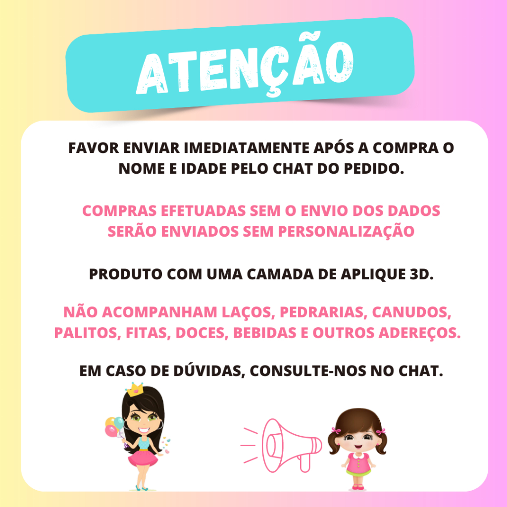 NO ATO DA COMPRA INFORMAR DADOS PARA PERSONALIZAR**, DATA DO EVENTO E AGUARDAR O PRAZO DE PRODUÇÃO! ----------LEIA ------ IMPORTANTE ---------- OBS: Não acompanham laços e pedrarias. >>> Produzido em papel Fotográfico de alta qualidade; >>> Todos os pedidos são produzidos a partir da data que foi comprovado o pagamento. >>> O Prazo de produção compõe desde a criação da arte até o envio e é computado em dias úteis (sem contar Finais de Semana e Feriados). O prazo pode sofrer alterações, para mais ou para menos, de acordo com a necessidade do cliente ou a demanda. (Obs.: Caso sofra alteração no prazo, o cliente será informado, do contrario, permanecerá o prazo de produção do anúncio) >>> Pode ocorrer pequena variação de tonalidade das cores dependendo da configuração e resolução de cada monitor. >>> O tamanho pode variar de acordo com a personalização ou tema. >>> Confira seu endereço de entrega, pois não temos acesso para alterá-lo e o frete é calculado com base no CEP cadastrado. >>> Faça sua encomenda com antecedência! Não achou o tema ou item da sua festa? Entre em contato conosco que verificamos para você! Para demais informações, dúvidas ou sugestões, entre em contato clicando em no "Chat com Vendedor", teremos o prazer em atendê-lo(a).