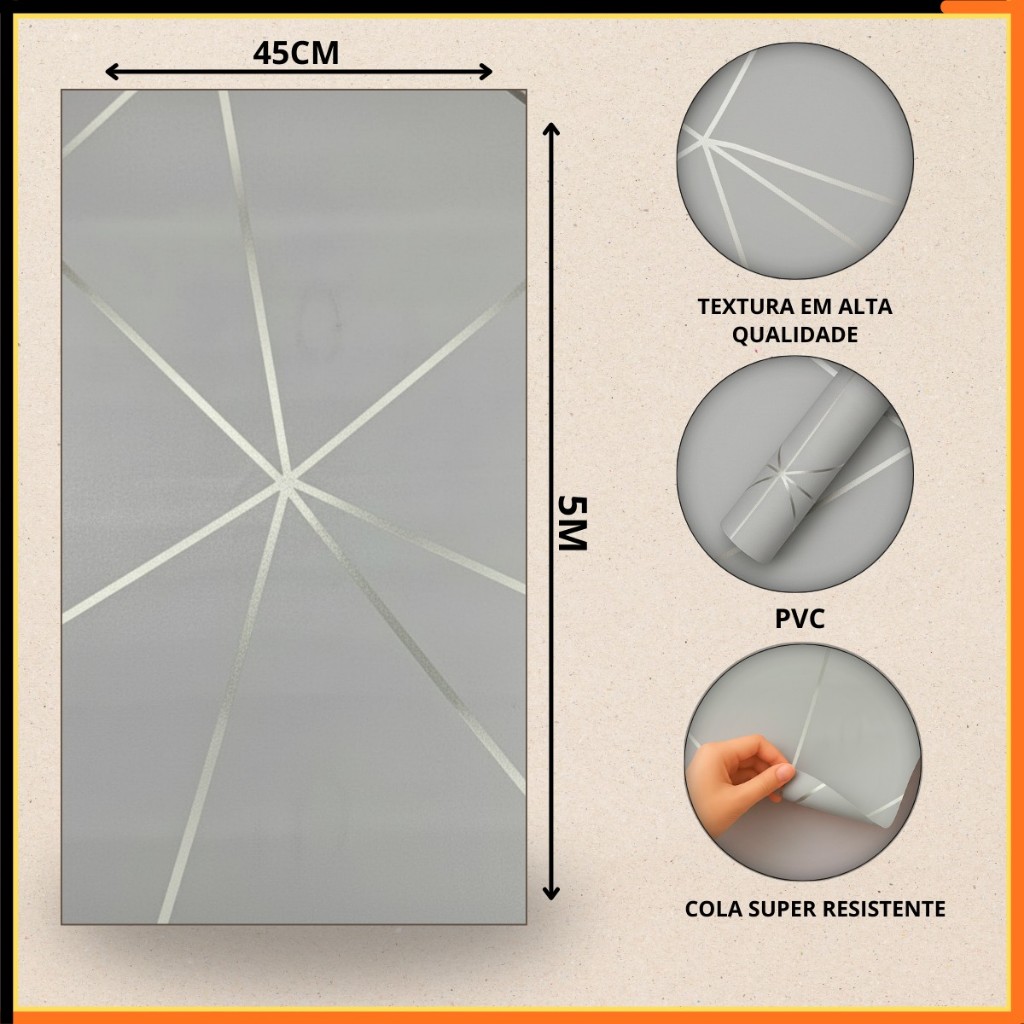 5 a 20 Metros de Papel Adesivo Cinza Geométrico com Linhas Brancas Decorativo de Ambiente **ATENÇÃO!** 1º- O ideal é comprar um rolo a mais que o necessário, para garantir a mesma tonalidade do produto, caso você perca algum pedaço na hora da aplicação. 2º- O papel de parede é liso e não possui relevo. (NÃO NOS RESPONSABILIZAMOS POR COMPRAS DE DATAS DIFERENTES, NOSSO ESTOQUE ESTÁ EM CONSTANTE MUDANÇA, POR ISSO SEMPRE SUGERIMOS QUE FAÇA UMA UNICA COMPRA PARA QUE NAO HAJA MUDANÇA DE TONALIDADE DOS PAPEIS DE PAREDE!) MEDIDA DE CADA ROLO: - Altura 5 Metros - Largura 45 Centímetros. OBS: CADA ROLO TEM 5 METROS Informe o tamanho da área que deseja aplicar, caso precise de ajuda no cálculo de quantidade de rolos. Rolo de adesivo com impressão em alta resolução. Ideal para aplicação em paredes ou qualquer superfície lisa, Geladeira, Fogão, Armário, Guarda-Roupa etc. Pode molhar (lavável) e ser aplicado em paredes de cozinha (próximo a fogões), dentro do box de banheiro etc. **ATENÇÃO!** 1º- O ideal é comprar um rolo a mais que o necessário, para garantir a mesma tonalidade do produto, caso você perca algum pedaço na hora da aplicação. 2º- O papel de parede é liso e não possui relevo. (NÃO NOS RESPONSABILIZAMOS POR COMPRAS DE DATAS DIFERENTES, NOSSO ESTOQUE ESTÁ EM CONSTANTE MUDANÇA, POR ISSO SEMPRE SUGERIMOS QUE FAÇA UMA UNICA COMPRA PARA QUE NAO HAJA MUDANÇA DE TONALIDADE DOS PAPEIS DE PAREDE!) COMO APLICAR O PLÁSTICO AUTOADESIVO: 1 - Limpe e seque a área de aplicação. 2 - Corte o material um pouco maior do que a medida necessária. 3 - Descole uma ponta de 5 cm do papel protetor e aplique o produto a partir dos cantos da área a ser revestida. 4 - Com uma mão, descole aos poucos o papel protetor em diagonal. Com a outra, fixe o produto do centro para as bordas utilizando uma flanela. 5 - Para evitar bolhas pressione bem ao aplicar. 6 - Caso o material fique torto, descole o adesivo com cuidado e reinicie a aplicação. 7 - Pressione bem o produto aplicado para maior fixação. Para eliminar bolhas, faça pequenos furos com uma agulha fina. 8 - Não aplique esse produto em superfícies porosas, ásperas, oleosas, ou áreas expostas a forte calor. Não é necessária contratação de profissional adesivador.
