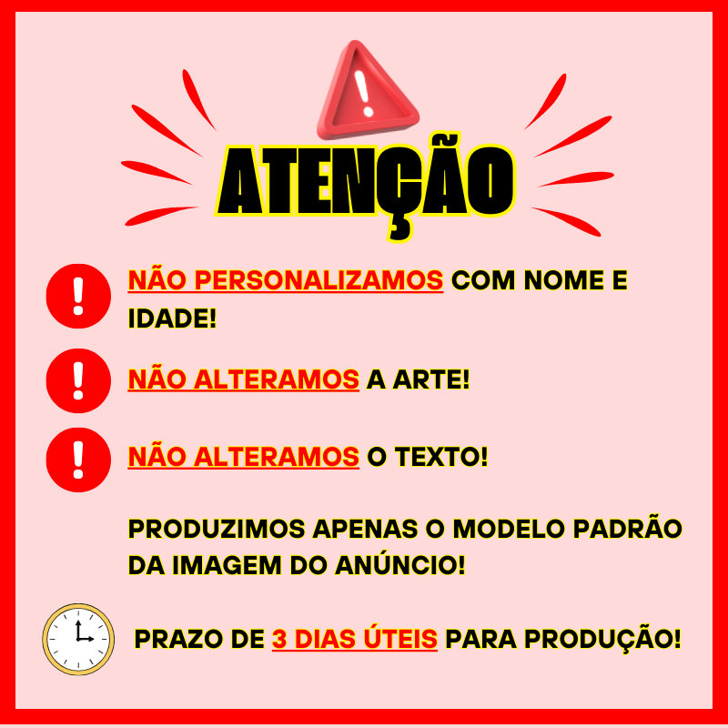 ⚠️ LEIA TODAS AS INFORMAÇÕES ANTES DE REALIZAR SUA COMPRA ⚠️ 🚨Prazo de produção 3 DIAS ÚTEIS. 🚨NÃO personalizamos com NOME E IDADE. 🚨NÃO alteramos a arte. 🚨NÃO alteramos o texto. PRODUZIMOS APENAS O MODELO PADRÃO DA IMAGEM DO ANÚNCIO! 🚨 PRODUTO PEGUE E MONTE! 🚨 -Enviado recortado e com vinco para finalizar a montagem em casa. -Necessita de cola para finalizar a montagem (pode ser cola branca, cola pano ou cola quente). -Acompanha vídeo tutorial para ajudar na montagem. ✨ CARACTERÍSTICAS ✨ -Material: Agora em Papel FOTOGRÁFICO 180g (glossy). Impressão de alta qualidade. -Medidas: 10cm Largura x 14cm Altura. -Com base de papel embaixo para dar mais estabilidade. -As cores do produto podem variar de tonalidade de acordo com a configuração de cada monitor. 📦 Frete e Prazo de Entrega 📦 -Não conseguimos dar certeza do dia da entrega pois a logística é realizada pela shopee e não pelos vendedores. É importante acompanhar direitinho o prazo informado pela plataforma. -Verifique o prazo de entrega diretamente na plataforma da Shopee.