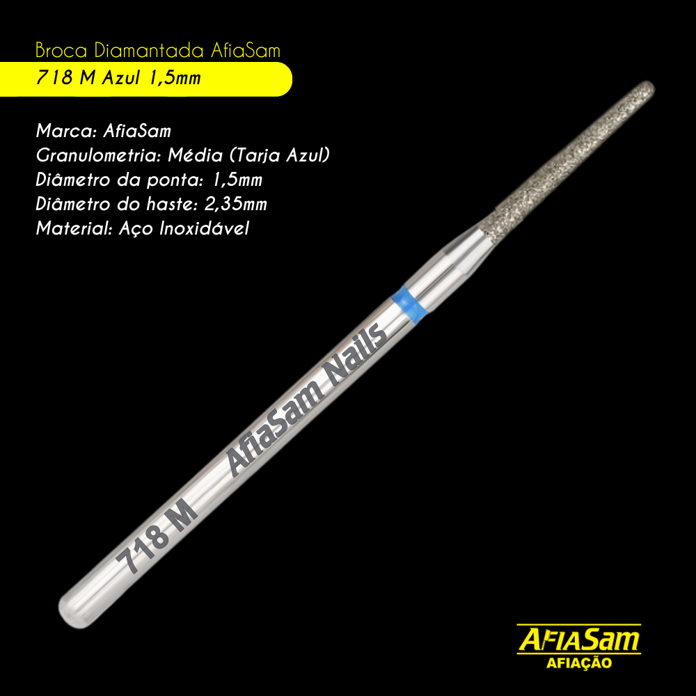 Kit 5 Brocas Diamantadas 718 M Ponta de Lápis P/ Alongamento de Unhas Contém: 05 Brocas Diamantadas 718 M Marca: AfiaSam Nails Granulometria: Média (Tarja Azul) Tipo: Cônica, Ponta de Lápis / Agulha Diâmetro da Ponta: 1,5mm Comprimento da ponta: 12mm Diâmetro da Haste: 2,35mm Padrão: PM (Peça de Mão) - Cabem em Modelos de Lixa Elétrica de Unhas que tenham o encaixe de 2,35mm ou o encaixe regulável. Material: Aço Inoxidável Uso: Afastamento da cutícula, nivelamento do alongamento, nivelamento do gel próximo a cutícula e remoção de unha crescida embaixo do alongamento Tipos de Esterilização: Autoclave, Estufa e Química. As Brocas Diamantadas são essenciais para técnicas delicadas, como a cutilagem russa. São usadas para remover cutículas, polir, nivelar, modelar, preparar a unha para alongamentos, retirar oleosidade, calosidades, gel e esmaltes. São chamadas de "diamantadas" por possuírem partículas de diamante na superfície, que oferecem abrasão precisa e eficiente. No entanto, não são recomendadas para a remoção de grandes volumes de material, pois isso pode causar o desgaste ou a perda dos grãos, comprometendo o desempenho da broca. Rotação recomendada: 15.000 a 25.000 RPM. Evite ultrapassar essa faixa de rotação, pois velocidades elevadas geram calor excessivo, o que compromete os grãos de diamante, reduz a vida útil da broca e pode causar danos à unha natural e à pele ao redor, além de desconforto e possíveis lesões.