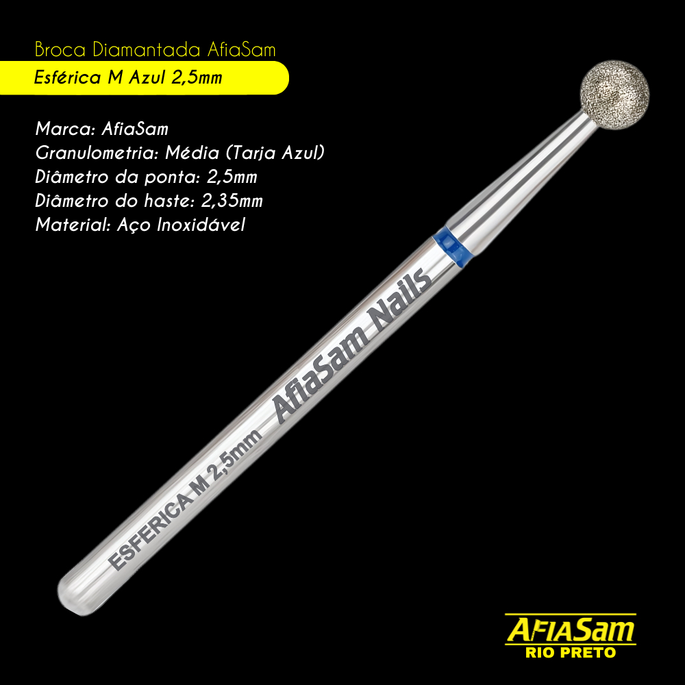 Kit 5 Broca Diamantada Esférica Azul 2,5mm Unhas Alongamento Contém: 5 Broca Diamantada Esférica Azul 2,5mm Marca: AfiaSam Nails Granulometria: Média (Tarja Azul) Tipo: Esférica Diâmetro da Ponta: 2,5mm Diâmetro da Haste: 2,35mm Padrão: PM (Peça de Mão) - Cabem em Modelos de Lixa Elétrica de Unhas que tenham o encaixe de 2,35mm ou o encaixe regulável. Material: Aço Inoxidável Uso: Para remoção de cutículas, abertura lateral das cutículas e desencravamento laterais das unhas Esterilização: Autoclave, Estufa e Química. Similar aos modelos FA01B025 / PM06 As Brocas Diamantadas são essenciais para técnicas delicadas, como a cutilagem russa. São usadas para remover cutículas, polir, nivelar, modelar, preparar a unha para alongamentos, retirar oleosidade, calosidades, gel e esmaltes. São chamadas de "diamantadas" por possuírem partículas de diamante na superfície, que oferecem abrasão precisa e eficiente. No entanto, não são recomendadas para a remoção de grandes volumes de material, pois isso pode causar o desgaste ou a perda dos grãos, comprometendo o desempenho da broca. Rotação recomendada: 15.000 a 25.000 RPM. Evite ultrapassar essa faixa de rotação, pois velocidades elevadas geram calor excessivo, o que compromete os grãos de diamante, reduz a vida útil da broca e pode causar danos à unha natural e à pele ao redor, além de desconforto e possíveis lesões.