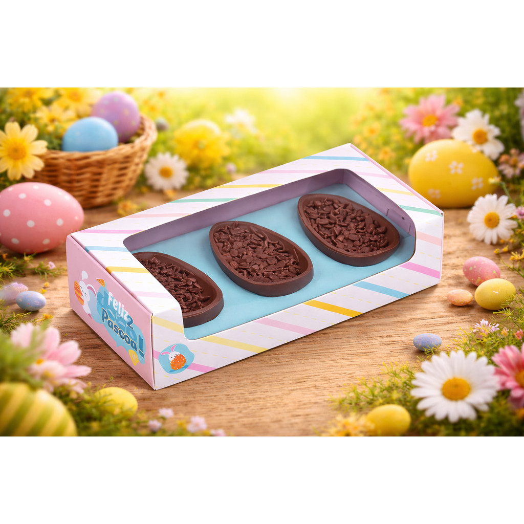 Caixa temática de Páscoa com visor transparente, ideal para presentear e valorizar seus produtos artesanais. A embalagem possui design em tons pastel com listras delicadas e estampa “Feliz Páscoa”, transmitindo leveza, carinho e sofisticação. O visor frontal em acetato permite total visualização do conteúdo, destacando os três ovos de chocolate recheados acomodados em berço interno azul, que garante melhor apresentação e estabilidade.