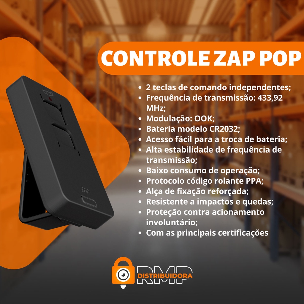 Seja bem-vindo a RMP DISTRIBUIDORA. LEMBRANDO QUE ENVIAMOS SUA MERCADORIA EM MENOS DE 24HRS. DEVIDAMENTE TESTADOS E COM NOTA FISCAL. Revolucione a maneira como você controla o seu portão com o Controle Remoto Zap Pop da marca PPA. Este controle remoto é uma inovação em automação residencial, projetada para oferecer comodidade, segurança e facilidade de uso. Seu design ergonômico e intuitivo torna a operação fácil e acessível a todos. Produto de fácil instalação. CONTROLE REMOTO ZAP POP 433MHZ PRETO Especificações: - 2 teclas de comando independentes; - Frequência de transmissão: 433,92 MHz; - Modulação: OOK; - Bateria modelo CR2032; - Acesso fácil para a troca de bateria; - Alta estabilidade de frequência de transmissão; - Baixo consumo de operação; - Protocolo código rolante PPA; - Alça de fixação reforçada; - Resistente a impactos e quedas; - Proteção contra acionamento involuntário; - Novo design; - Apenas na cor preta - Medidas aproximadas: 32mm x 64mm x 10mm Conteúdo da Embalagem: 05 Controle Remoto ZAP POP 433Mhz PPA 05 Alça de fixação 05 Bateria já inclusa Importante: Garantia contra defeito de fabricação de 90 dias. Marca: PPA Atenção: Compatível com maioria das marcas do mercado com código fixo e código rolante como: (PPA, RCG, GAREN, AGL, ACTON, IPEC, OMEGA SAT, entre outros), exceto ROSSI e PECCININ que não funcionam, pois essas marcas trabalham somente com controle próprio.